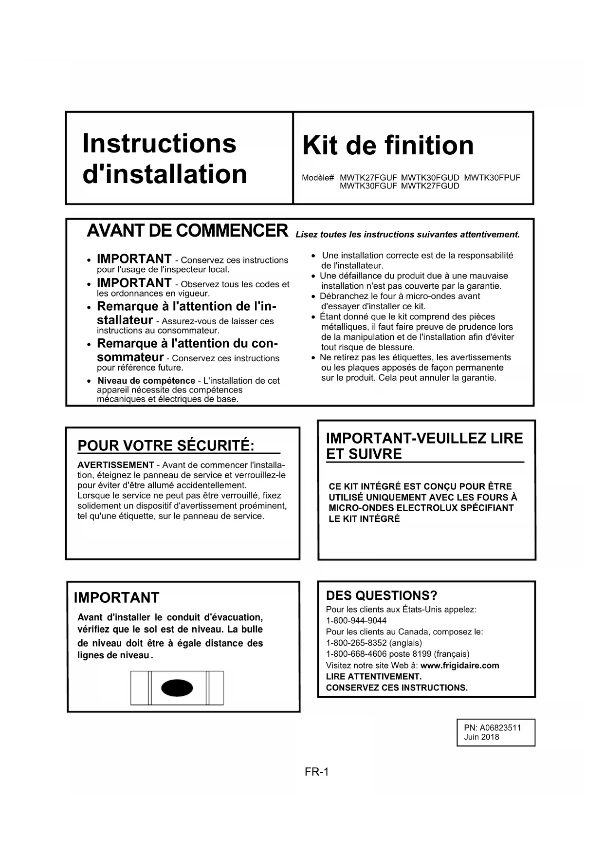 - Niveau de compétence - L'installation de cet appareil nécessite des compétences mécaniques et électriques de base.AVERTISSEMENT - Avant de commencer l'installa-tion, éteignez le panneau de service et verrouillez-le pour éviter d'être allumé accidentellement.Lorsque le service ne peut pas être verrouillé, fixez solidement un dispositif d'avertissement proéminent, tel qu'une étiquette, sur le panneau de service.CE KIT INTÉGRÉ EST CONÇU POUR ÊTRE UTILISÉ UNIQUEMENT AVEC LES FOURS À MICRO-ONDES ELECTROLUX SPÉCIFIANT LE KIT INTÉGRÉ Pour les clients aux États-Unis appelez: 1-800-944-9044 Pour les clients au Canada, composez le: 1-800-265-8352 (anglais) 1-800-668-4606 poste 8199 (français) Visitez notre site Web à: www.frigidaire.com LIRE ATTENTIVEMENT. CONSERVEZ CES INSTRUCTIONS. IMPORTANT Avant d'installer le conduit d'évacuation, vérifiez que le sol est de niveau. La bulle de niveau doit être à égale distance des lignes de niveau .FR-2
