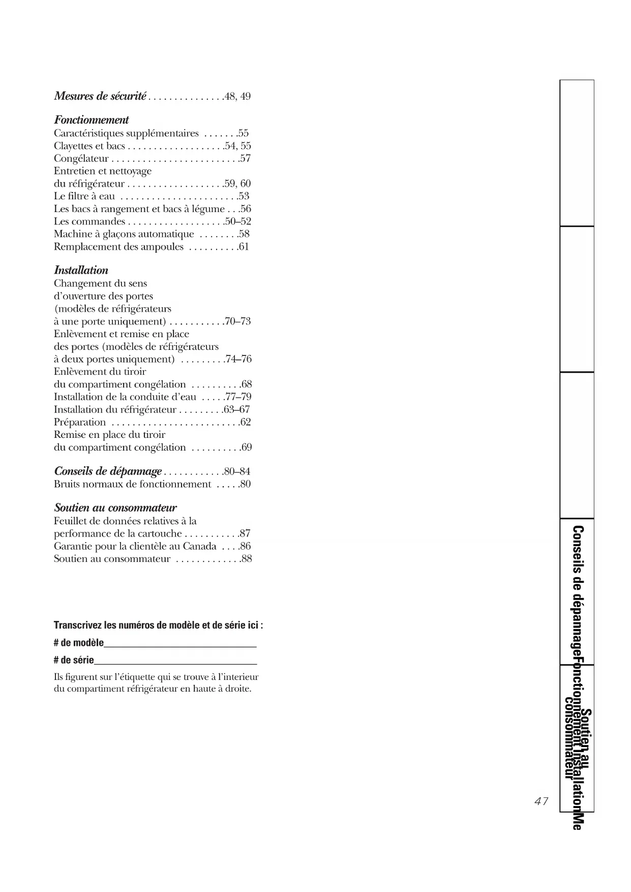 Soutien au consommateur Conseils de dépannage Fonctionnement Mesures de sécurité Installation Avant d’appeler un réparateur…85 Notes. www.electromenagersge.ca Soutien au consommateur Conseils de dépannageFonctionnementMesures de sécurité Installation86