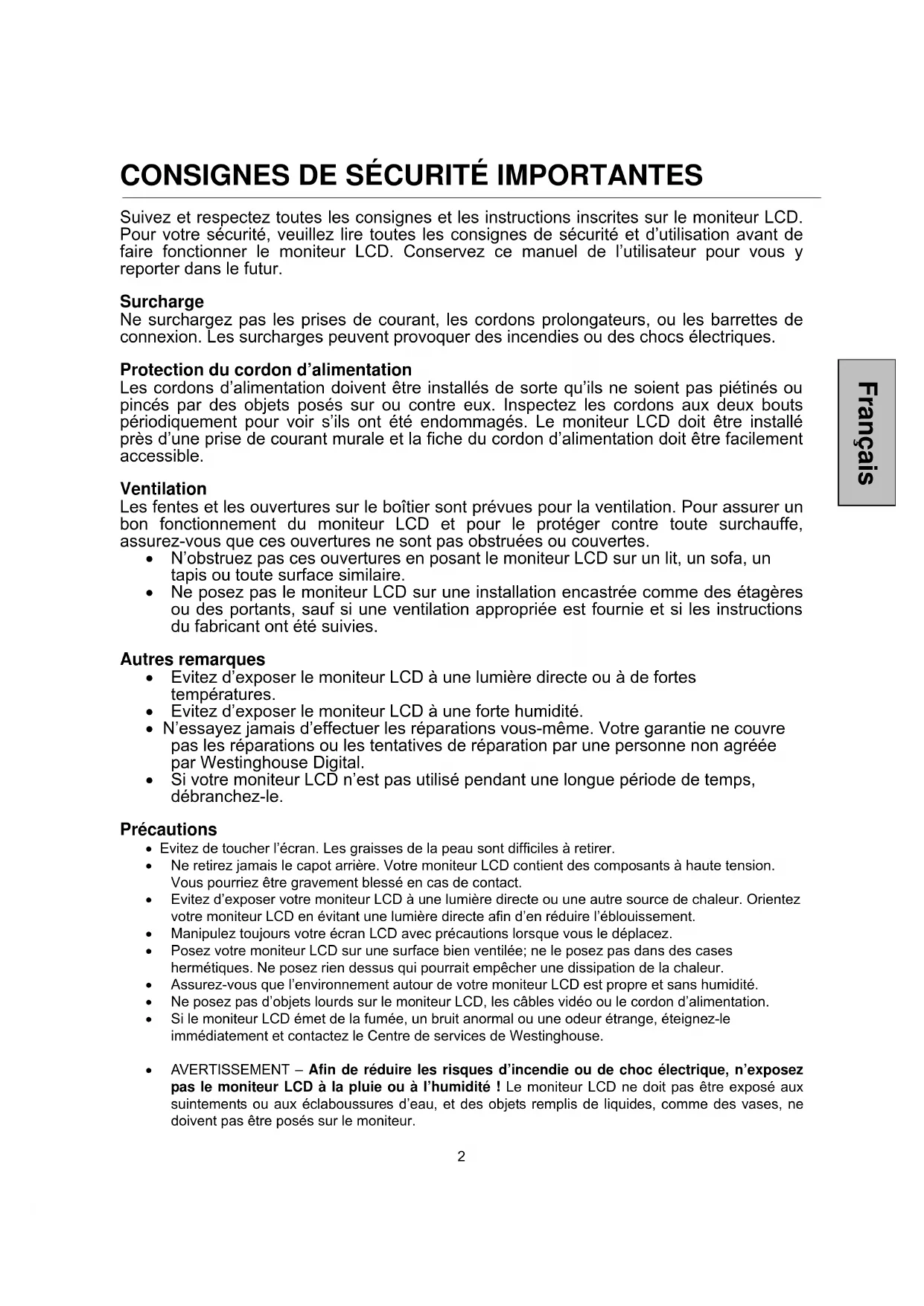 - Si le moniteur LCD émet de la fumée, un bruit anormal ou une odeur étrange, éteignez-le immédiatement et contactez le Centre de services de Westinghouse.