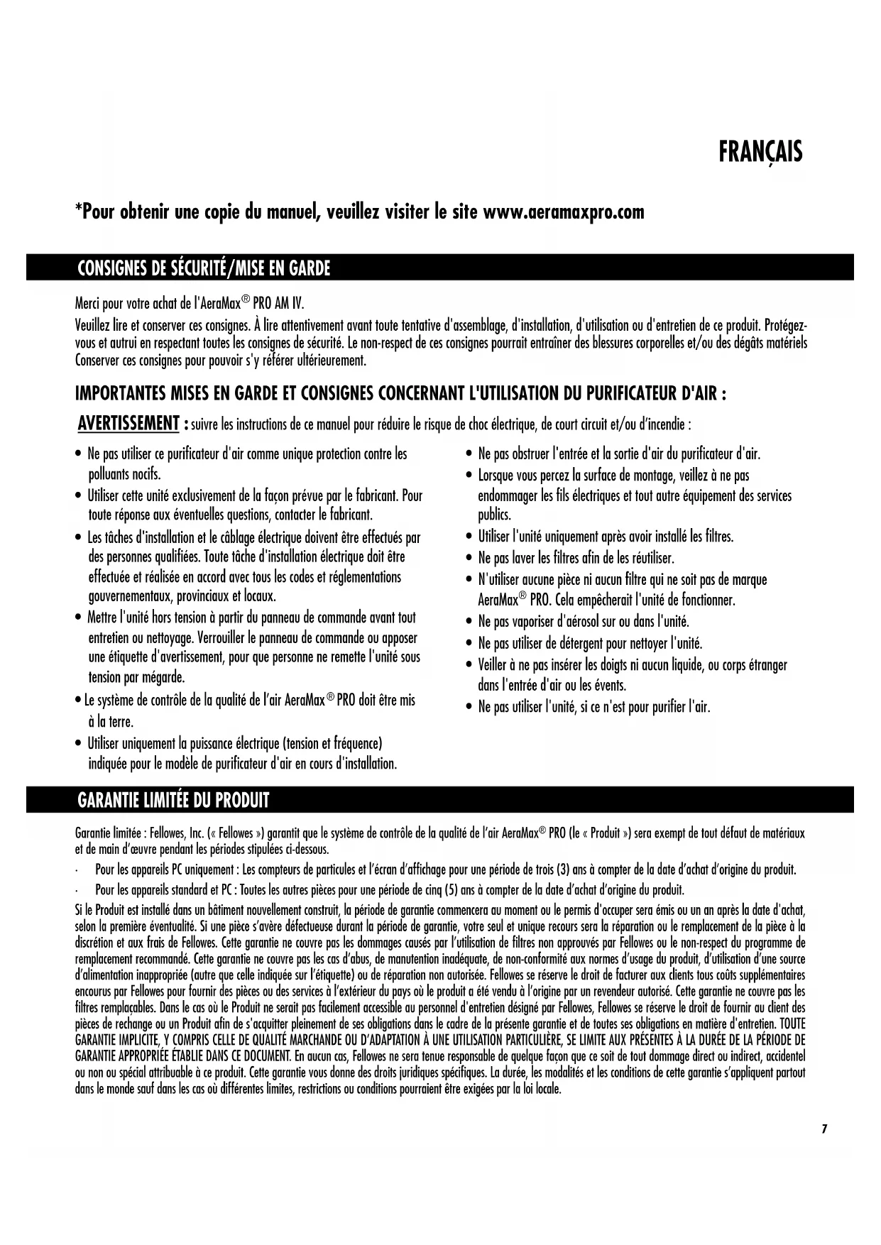 PRO AM IV. Veuillez lire et conserver ces consignes. À lire attentivement avant toute tentative d'assemblage, d'installation, d'utilisation ou d'entretien de ce produit. Protégez- vous et autrui en respectant toutes les consignes de sécurité. Le non-respect de ces consignes pourrait entraîner des blessures corporelles et/ou des dégâts matériels Conserver ces consignes pour pouvoir s'y référer ultérieurement. IMPORTANTES MISES EN GARDE ET CONSIGNES CONCERNANT L'UTILISATION DU PURIFICATEUR D'AIR : *Pour obtenir une copie du manuel, veuillez visiter le site www.aeramaxpro.com