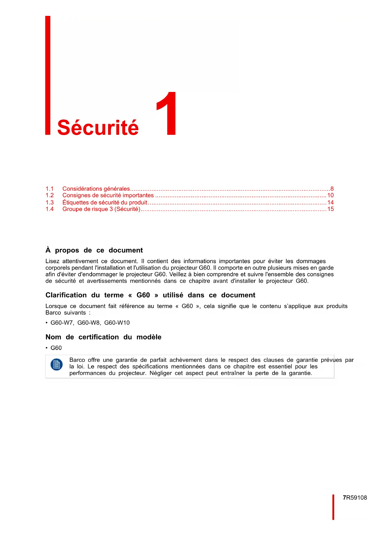 - 1.4 Groupe de risque 3 (Sécurité) À propos de ce document Lisez attentivement ce document. Il contient des informations importantes pour éviter les dommages corporels pendant l'installation et l'utilisation du projecteur G60. Il comporte en outre plusieurs mises en garde afin d'éviter d'endommager le projecteur G60. Veillez à bien comprendre et suivre l'ensemble des consignes de sécurité et avertissements mentionnés dans ce chapitre avant d'installer le projecteur G60. Clarification du terme « G60 » utilisé dans ce document Lorsque ce document fait référence au terme « G60 », cela signifie que le contenu s’applique aux produits Barco suivants : p. 15