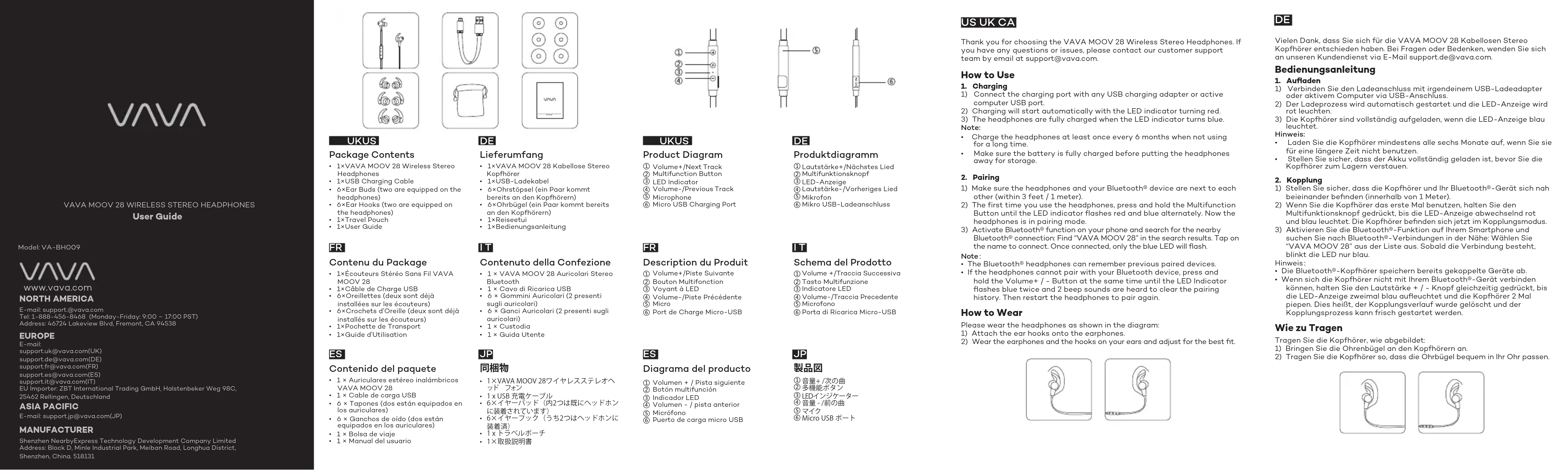 User Guide DC INMerci d'avoir choisi les Écouteurs Stéréo Sans Fil VAVA MOOV 28. Si vous avez des questions ou des problèmes, veuillez contacter notre équipe de support client par email à l’adresse support.fr@vava.com. Mode d’Emploi