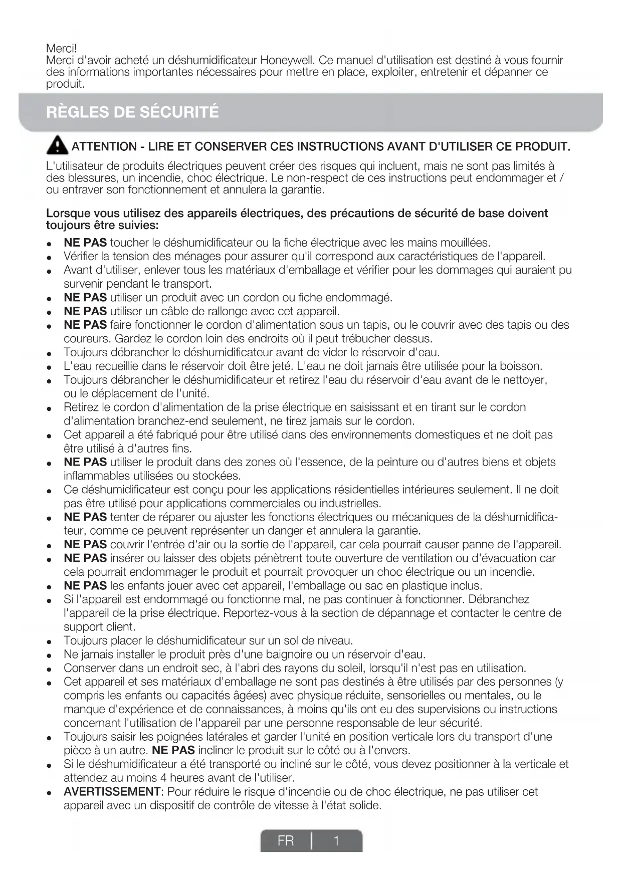 ES 8Merci! Merci d'avoir acheté un déshumidificateur Honeywell. Ce manuel d'utilisation est destiné à vous fournir des informations importantes nécessaires pour mettre en place, exploiter, entretenir et dépanner ce produit. L'utilisateur de produits électriques peuvent créer des risques qui incluent, mais ne sont pas limités à des blessures, un incendie, choc électrique. Le non-respect de ces instructions peut endommager et / ou entraver son fonctionnement et annulera la garantie. Lorsque vous utilisez des appareils électriques, des précautions de sécurité de base doivent toujours être suivies:
