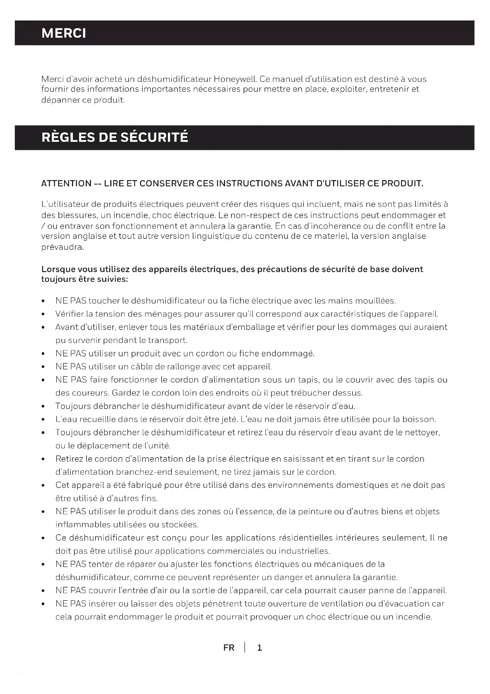 Merci d'avoir acheté un déshumidificateur Honeywell. Ce manuel d'utilisation est destiné à vous fournir des informations importantes nécessaires pour mettre en place, exploiter, entretenir et dépanner ce produit. ATTENTION -- LIRE ET CONSERVER CES INSTRUCTIONS AVANT D'UTILISER CE PRODUIT. L'utilisateur de produits électriques peuvent créer des risques qui incluent, mais ne sont pas limités à des blessures, un incendie, choc électrique. Le non-respect de ces instructions peut endommager et / ou entraver son fonctionnement et annulera la garantie. En cas d'incoherence ou de conflit entre la version anglaise et tout autre version linguistique du contenu de ce materiel, la version anglaise prévaudra. Lorsque vous utilisez des appareils électriques, des précautions de sécurité de base doivent toujours être suivies: