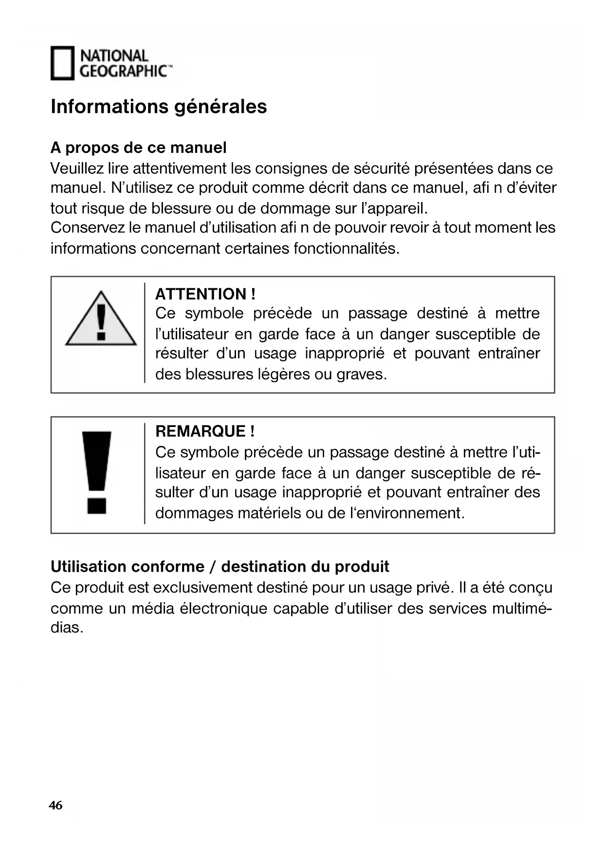 Informations générales A propos de ce manuel Veuillez lire attentivement les consignes de sécurité présentées dans ce manuel. N’utilisez ce produit comme décrit dans ce manuel, afi n d’éviter tout risque de blessure ou de dommage sur l’appareil. Conservez le manuel d’utilisation afi n de pouvoir revoir à tout moment les informations concernant certaines fonctionnalités. ATTENTION ! Ce symbole précède un passage destiné à mettre l’utilisateur en garde face à un danger susceptible de résulter d’un usage inapproprié et pouvant entraîner des blessures légères ou graves. REMARQUE ! Ce symbole précède un passage destiné à mettre l’uti- lisateur en garde face à un danger susceptible de ré- sulter d’un usage inapproprié et pouvant entraîner des dommages matériels ou de l‘environnement. Utilisation conforme / destination du produit Ce produit est exclusivement destiné pour un usage privé. Il a été conçu comme un média électronique capable d’utiliser des services multimé- dias.FR