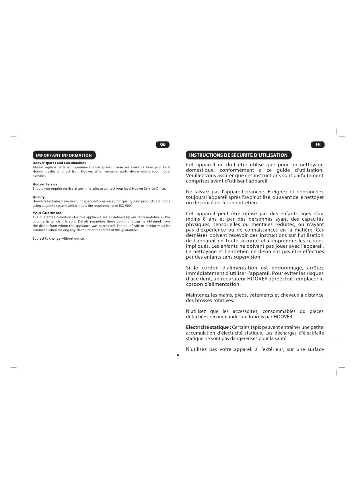 FRGB IMPORTANT INFORMATION Hoover spares and Consumables Always replace parts with genuine Hoover spares. These are available from your local Hoover dealer or direct from Hoover. When ordering parts always quote your model number. Hoover Service Should you require service at any time, please contact your local Hoover Service Office. Quality Hoover’s factories have been independently assessed for quality. Our products are made using a quality system which meets the requirements of ISO 9001. Your Guarantee The guarantee conditions for this appliance are as defined by our representative in the country in which it is sold. Details regarding these conditions can be obtained from the dealer from whom the appliance was purchased. The bill of sale or receipt must be produced when making any claim under the terms of this guarantee. Subject to change without notice.humide ou pour un ramassage humide. N’aspirez pas d’objets durs ou tranchants, d’allumettes, de cendres chaudes, de mégots de cigarettes ou d’autres objets similaires. Ne pulvérisez ou n’aspirez pas des liquides inflammables, des produits d’entretien liquides, des aérosols ou leurs vapeurs. Ne marchez pas sur le cordon d’alimentation lorsque vous utilisez votre appareil et ne le débranchez pas de la prise en tirant sur le cordon d’alimentation. Ne continuez pas à utiliser votre appareil s’il semble défectueux. Service HOOVER : Pour assurer l’utilisation sûre et efficace de cet appareil, nous recommandons de n’en confier l’entretien ou les réparations qu’à un réparateur HOOVER agréé. Ne marchez pas sur le cordon d’alimentation ou ne l’enroulez pas sur vos bras ou vos jambes quand vous utilisez l’appareil. N’utilisez pas l’appareil sur des personnes ou des animaux. Lors du nettoyage des escaliers, ne placez pas l’appareil dans une position plus haute que la vôtre. Environnement Le symbole figurant sur cet appareil indique qu’il ne peut pas être considéré comme une ordures ménagères. Vous devez le déposer dans un centre de recyclage des déchets électriques et électroniques. La déposition doit être effectuée conformément à la réglementation locale en matière de déchets. Pour obtenir des compléments d’information sur le traitement, la récupération et le recyclage de cet appareil, veuillez contacter votre municipalité, le service local d’élimination des ordures ménagères ou le revendeur de l’appareil. Cet appareil est conforme aux Directives européennes 2014/35/EU, 2014/30/EU et 2011/65/UE. CANDY HOOVER GROUP S.r.l. Via Privata Eden Fumagalli, 20861 Brugherio (MB) Italy