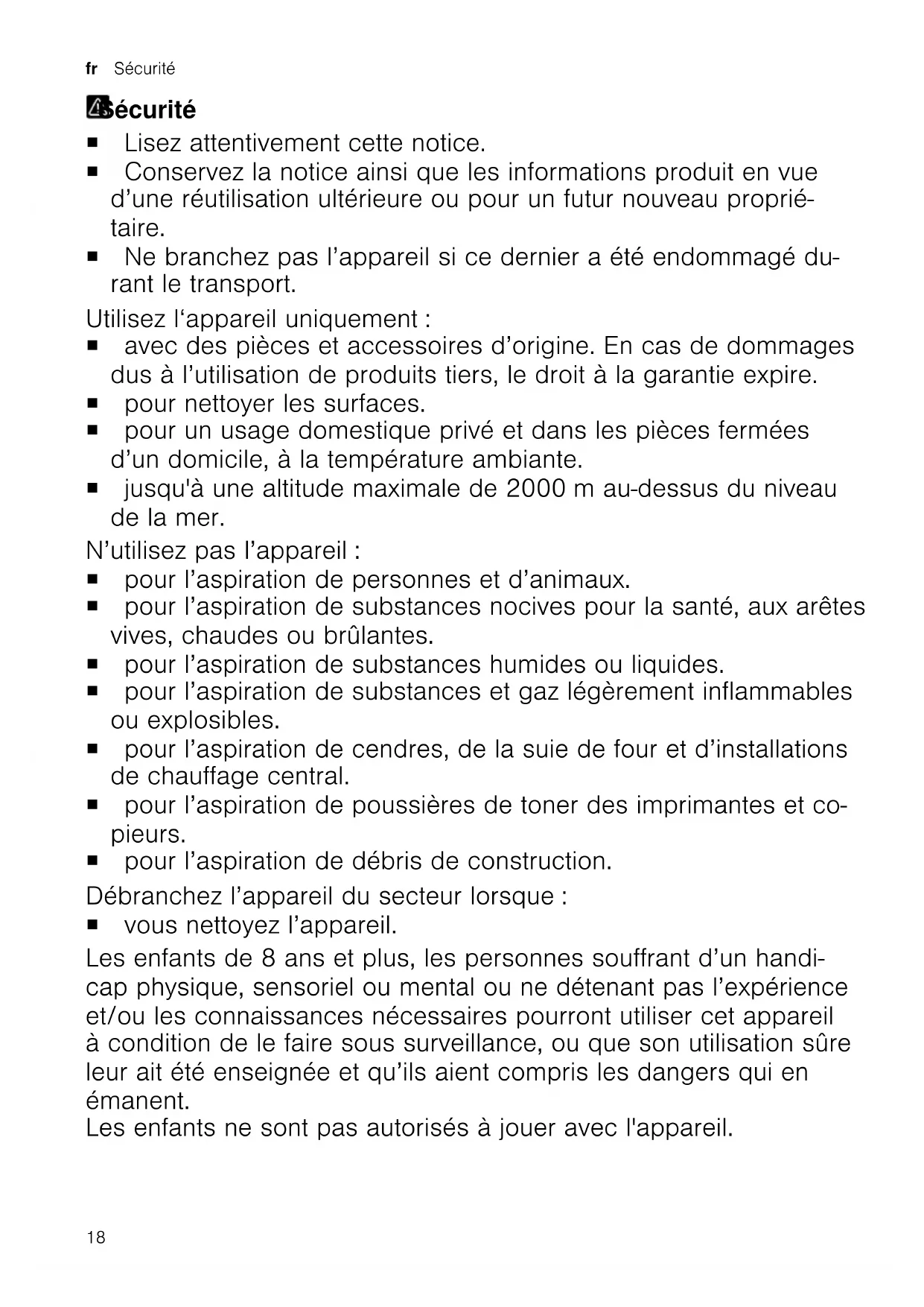 Remove the blockage. Brush on the turbo nozzle does not turn. Brush roller is soiled. Clean the brush roller. Suction power is too low. Turn the power controller to maximum suction power. Disposing of old applianceDisposing of old appliance Dispose of the appliance in an environ- mentally friendly manner. Information about current disposal meth- ods are available from your specialist dealer or local authority. This appliance is labelled in accordance with European Directive 2012/19/EU con- cerning used electrical and electronic appliances (waste electrical and electronic equipment - WEEE). The guideline determines the framework for the return and recycling of used appliances as applicable throughout the EU. Customer ServiceCustomer Service Detailed information about the warranty period and the warranty conditions in your country is available via the QR code on the enclosed document on service contacts and warranty conditions, from our customer service or on our website. You can find the contact details for our cus- tomer service via the QR code on the en- closed document on service contacts and warranty conditions or on our website. You can find the information required as per Regulation (EU) 2023/826 online at www.bosch-home.com on the product and service pages for your appliance, in the area of user manuals and additional docu- ments. 17fr Sécurité Sécurité Sécurité ¡ Lisez attentivement cette notice. ¡ Conservez la notice ainsi que les informations produit en vue d’une réutilisation ultérieure ou pour un futur nouveau proprié- taire. ¡ Ne branchez pas l’appareil si ce dernier a été endommagé du- rant le transport. Utilisez l‘appareil uniquement: ¡ avec des pièces et accessoires d’origine. En cas de dommages dus à l’utilisation de produits tiers, le droit à la garantie expire. ¡ pour nettoyer les surfaces. ¡ pour un usage domestique privé et dans les pièces fermées d’un domicile, à la température ambiante. ¡ jusqu'à une altitude maximale de 2000m au-dessus du niveau de la mer. N’utilisez pas l’appareil: ¡ pour l’aspiration de personnes et d’animaux. ¡ pour l’aspiration de substances nocives pour la santé, aux arêtes vives, chaudes ou brûlantes. ¡ pour l’aspiration de substances humides ou liquides. ¡ pour l’aspiration de substances et gaz légèrement inflammables ou explosibles. ¡ pour l’aspiration de cendres, de la suie de four et d’installations de chauffage central. ¡ pour l’aspiration de poussières de toner des imprimantes et co- pieurs. ¡ pour l’aspiration de débris de construction. Débranchez l’appareil du secteur lorsque: ¡ vous nettoyez l’appareil. Les enfants de 8 ans et plus, les personnes souffrant d’un handi- cap physique, sensoriel ou mental ou ne détenant pas l’expérience et/ou les connaissances nécessaires pourront utiliser cet appareil à condition de le faire sous surveillance, ou que son utilisation sûre leur ait été enseignée et qu’ils aient compris les dangers qui en émanent. Les enfants ne sont pas autorisés à jouer avec l'appareil. 18Sécurité fr Le nettoyage de l’appareil, et l’entretien par l’utilisateur, sont des activités que les enfants ne peuvent pas effectuer sans sur- veillance. Seul un personnel dûment qualifié peut entreprendre des répara- tions sur l'appareil. Seules des pièces de rechange d'origine peuvent être utilisées pour réparer l'appareil. Afin d’écarter tout danger quand le cordon d’alimentation sec- teur de cet appareil est endommagé, seul le fabricant ou son service après-vente ou toute autre personne de qualification équivalente est habilité à le remplacer. N'utilisez jamais un appareil endommagé. Ne jamais faire fonctionner l’appareil avec une surface fissurée ou cassée. Ne tirez jamais sur le cordon d'alimentation secteur pour débran- cher l'appareil du secteur. Débranchez toujours la fiche du cor- don d'alimentation secteur. Ne tirez et ne transportez jamais l'appareil par le cordon d'ali- mentation secteur. Si l'appareil ou le cordon d'alimentation secteur est endommagé, débranchez immédiatement le cordon d'alimentation secteur ou coupez le fusible dans le boîtier à fusibles. Appelez le service après-vente.