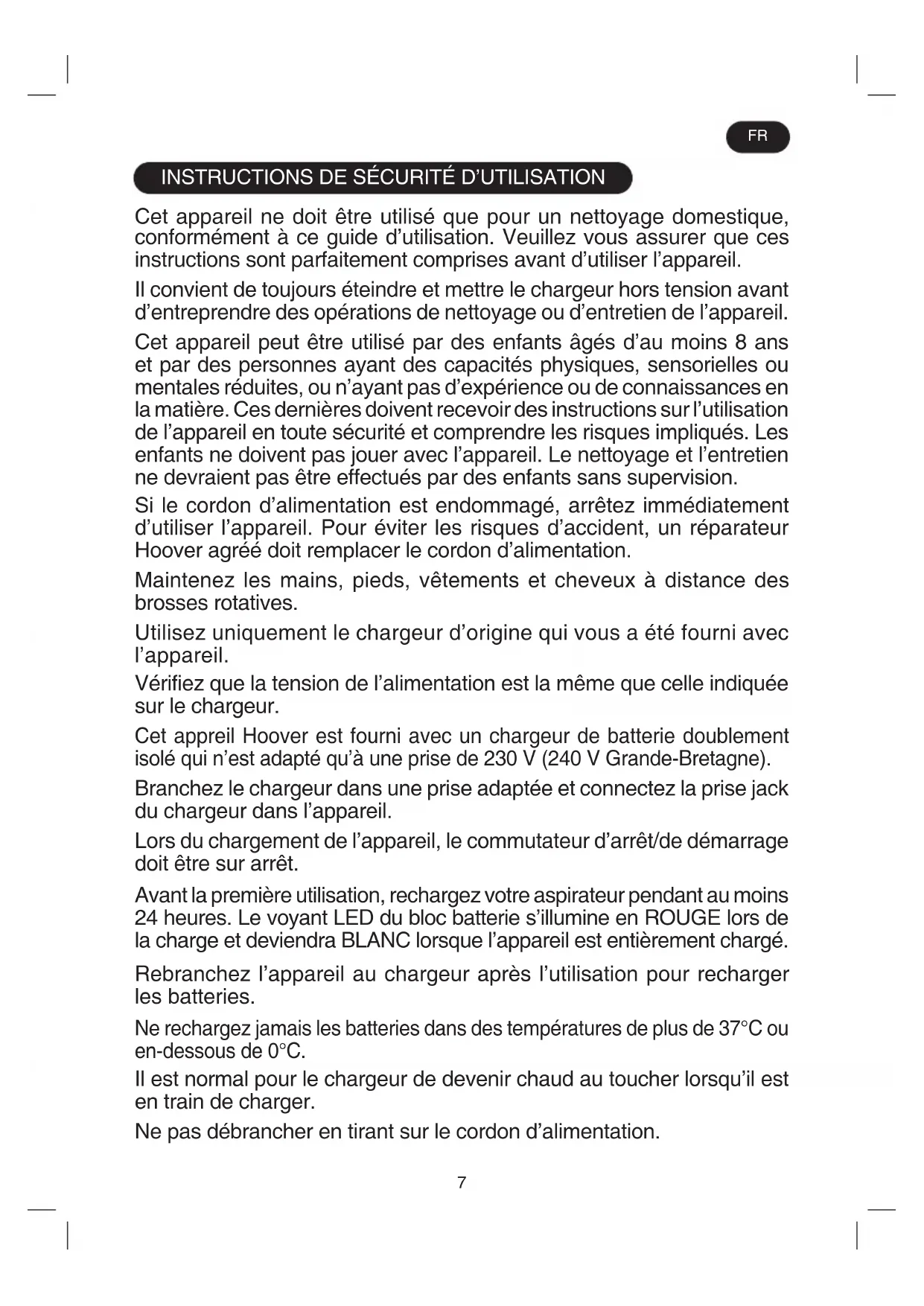 Cet appareil ne doit être utilisé que pour un nettoyage domestique, conformément à ce guide d’utilisation. Veuillez vous assurer que ces instructions sont parfaitement comprises avant d’utiliser l’appareil. Il convient de toujours éteindre et mettre le chargeur hors tension avant d’entreprendre des opérations de nettoyage ou d’entretien de l’appareil. Cet appareil peut être utilisé par des enfants âgés d’au moins 8 ans et par des personnes ayant des capacités physiques, sensorielles ou mentales réduites, ou n’ayant pas d’expérience ou de connaissances en la matière. Ces dernières doivent recevoir des instructions sur l’utilisation de l’appareil en toute sécurité et comprendre les risques impliqués. Les enfants ne doivent pas jouer avec l’appareil. Le nettoyage et l’entretien ne devraient pas être effectués par des enfants sans supervision. Si le cordon d’alimentation est endommagé, arrêtez immédiatement d’utiliser l’appareil. Pour éviter les risques d’accident, un réparateur Hoover agréé doit remplacer le cordon d’alimentation. Maintenez les mains, pieds, vêtements et cheveux à distance des brosses rotatives. Utilisez uniquement le chargeur d’origine qui vous a été fourni avec l’appareil. Vérifiez que la tension de l’alimentation est la même que celle indiquée sur le chargeur. Cet appreil Hoover est fourni avec un chargeur de batterie doublement isolé qui n’est adapté qu’à une prise de 230 V (240 V Grande-Bretagne). Branchez le chargeur dans une prise adaptée et connectez la prise jack du chargeur dans l’appareil. Lors du chargement de l’appareil, le commutateur d’arrêt/de démarrage doit être sur arrêt. Avant la première utilisation, rechargez votre aspirateur pendant au moins 24 heures. Le voyant LED du bloc batterie s’illumine en ROUGE lors de la charge et deviendra BLANC lorsque l’appareil est entièrement chargé. Rebranchez l’appareil au chargeur après l’utilisation pour recharger les batteries. Ne rechargez jamais les batteries dans des températures de plus de 37°C ou en-dessous de 0°C. Il est normal pour le chargeur de devenir chaud au toucher lorsqu’il est en train de charger. Ne pas débrancher en tirant sur le cordon d’alimentation. FR8 Débranchez le chargeur en cas d’absence prolongée (vacances, etc.). Rechargez l’appareil de nouveau avant de l’utiliser car les batteries peuvent se décharger toutes seules si elles sont stockées pendant longtemps. Si vous mettez l’appareil à la poubelle, il convient de retirer les batteries d’abord. L’appareil ne doit pas être branché à la prise, lorsque vous retirez les batteries. Mettez les batteries à la poubelle, dans un endroit sûr. Laissez fonctionner l’appareil jusqu’à l’arrêt total de l’appareil dû au fait que les batteries sont entièrement déchargées. Des batteries usées doivent être amenées à un point de recyclage et non pas être éliminées avec les ordures ménagères. Pour retirer les batteries, veuillez contacter le centre d’assistance Hoover ou suivez les instructions suivantes. IMPORTANT : Déchargez toujours complètement les piles avant de les retirer. Faites fonctionner le nettoyeur jusqu’à ce que les batteries soient complètement vides. Retirez la prise jack du chargeur de l’appareil. Appuyez sur le bouton de déverrouillage de la batterie et faites-la glisser pour la retirer. [3] Note : Si vous rencontrez des difficultés en démontant l’unité ou si vous souhaitez obtenir de plus amples informations concernant le traitement, la récupération et le recyclage de cet appareil, veuillez contacter les services de votre ville locale ou un service de traitement des ordures ménagères. N’utilisez que les accessoires, les consommables et les pièces de rechange recommandés ou fournis par Hoover. Electricité statique : certains tapis peuvent entraîner une petite accumulation d’électricité statique. Les décharges d’électricité statique ne sont pas dangereuses pour la santé. N’utilisez pas votre appareil à l’extérieur, sur une surface humide ou pour un ramassage humide. N’aspirez pas d’objets durs ou tranchants, d’allumettes, de cendres chaudes, de mégots de cigarettes ou d’autres objets similaires. Ne pulvérisez ou n’aspirez pas des liquides inflammables, des produits d’entretien liquides, des aérosols ou leurs vapeurs. Ne marchez pas sur le cordon d’alimentation lorsque vous utilisez votre appareil et ne le débranchez pas de la prise en tirant sur le cordon d’alimentation. Ne continuez pas à utiliser votre appareil ou votre chargeur s’il semble défectueux.