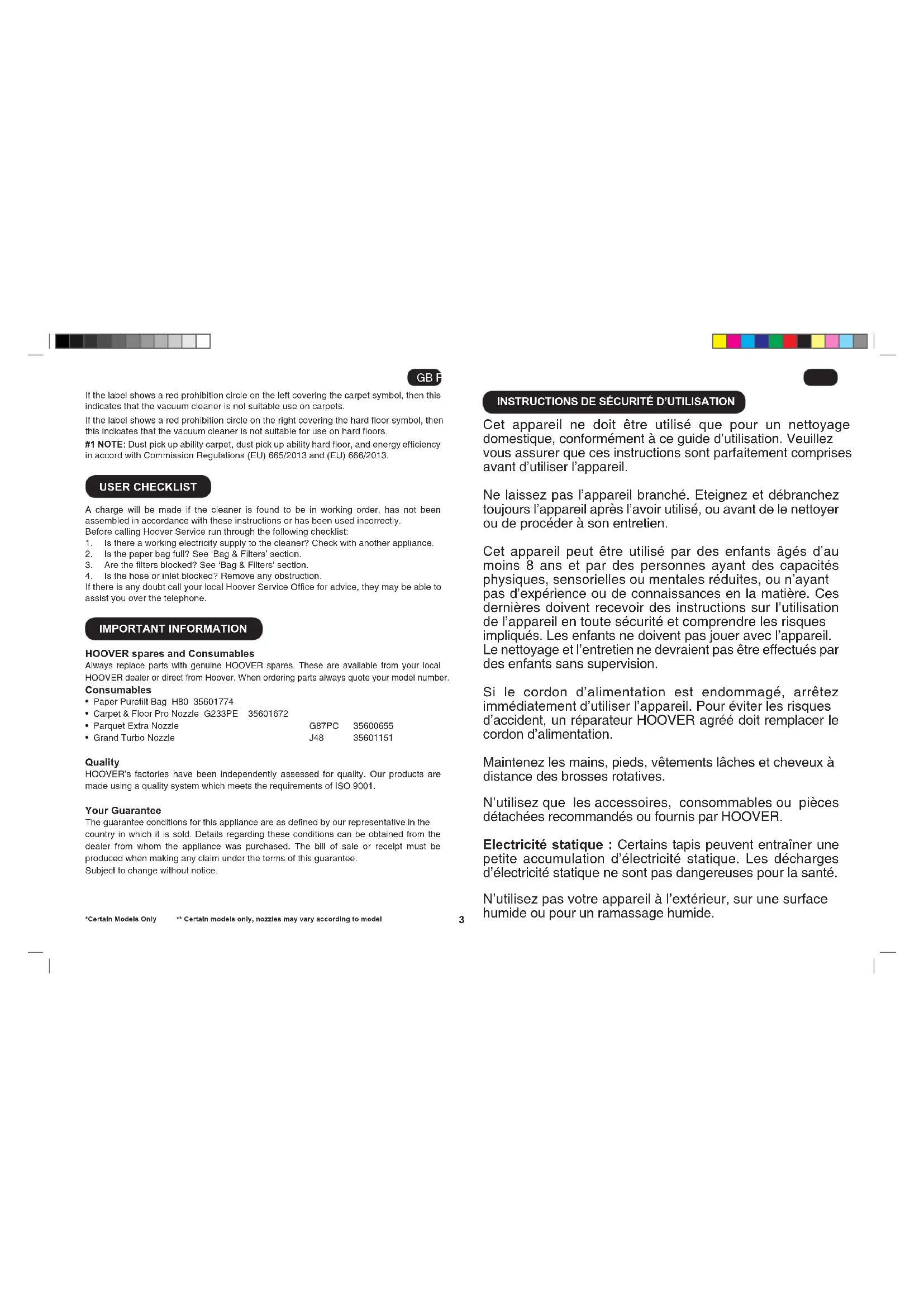 Service HOOVER: Pour assurer l'utilisation sûre et efficace de cet appareil, nous recommandons de n'en confier l'entretien ou les réparations qu'à un répartiteur HOOVER/agréé.