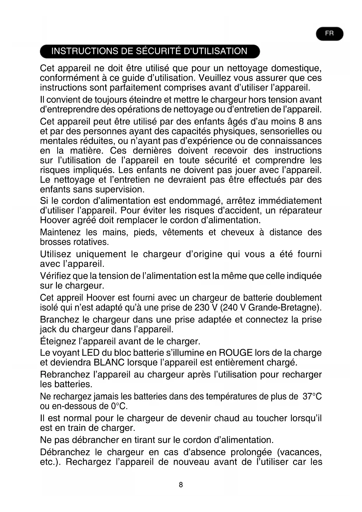 Cet appareil ne doit être utilisé que pour un nettoyage domestique, conformément à ce guide d’utilisation. Veuillez vous assurer que ces instructions sont parfaitement comprises avant d’utiliser l’appareil. Il convient de toujours éteindre et mettre le chargeur hors tension avant d’entreprendre des opérations de nettoyage ou d’entretien de l’appareil. Cet appareil peut être utilisé par des enfants âgés d’au moins 8 ans et par des personnes ayant des capacités physiques, sensorielles ou mentales réduites, ou n’ayant pas d’expérience ou de connaissances en la matière. Ces dernières doivent recevoir des instructions sur l’utilisation de l’appareil en toute sécurité et comprendre les risques impliqués. Les enfants ne doivent pas jouer avec l’appareil. Le nettoyage et l’entretien ne devraient pas être effectués par des enfants sans supervision. Si le cordon d’alimentation est endommagé, arrêtez immédiatement d’utiliser l’appareil. Pour éviter les risques d’accident, un réparateur Hoover agréé doit remplacer le cordon d’alimentation. Maintenez les mains, pieds, vêtements et cheveux à distance des brosses rotatives. Utilisez uniquement le chargeur d’origine qui vous a été fourni avec l’appareil. Vérifiez que la tension de l’alimentation est la même que celle indiquée sur le chargeur. Cet appreil Hoover est fourni avec un chargeur de batterie doublement isolé qui n’est adapté qu’à une prise de 230 V (240 V Grande-Bretagne). Branchez le chargeur dans une prise adaptée et connectez la prise jack du chargeur dans l’appareil. Éteignez l’appareil avant de le charger. Le voyant LED du bloc batterie s’illumine en ROUGE lors de la charge et deviendra BLANC lorsque l’appareil est entièrement chargé. Rebranchez l’appareil au chargeur après l’utilisation pour recharger les batteries. Ne rechargez jamais les batteries dans des températures de plus de 37°C ou en-dessous de 0°C. Il est normal pour le chargeur de devenir chaud au toucher lorsqu’il est en train de charger. Ne pas débrancher en tirant sur le cordon d’alimentation. Débranchez le chargeur en cas d’absence prolongée (vacances, etc.). Rechargez l’appareil de nouveau avant de l’utiliser car les FR9 batteries peuvent se décharger toutes seules si elles sont stockées pendant longtemps. Si vous mettez l’appareil à la poubelle, il convient de retirer les batteries d’abord. L’appareil ne doit pas être branché à la prise, lorsque vous retirez les batteries. Mettez les batteries à la poubelle, dans un endroit sûr. Laissez fonctionner l’appareil jusqu’à l’arrêt total de l’appareil dû au fait que les batteries sont entièrement déchargées. Des batteries usées doivent être amenées à un point de recyclage et non pas être éliminées avec les ordures ménagères. Pour retirer les batteries, veuillez contacter le centre d’assistance Hoover ou suivez les instructions suivantes. IMPORTANT: Déchargez toujours complètement les piles avant de les retirer. Faites fonctionner le nettoyeur jusqu’à ce que les batteries soient complètement vides. Retirez la prise jack du chargeur de l’appareil. Appuyez sur les boutons de déverrouillage du bloc batterie et faites glisser le bloc batterie pour le retirer. Note: Si vous rencontrez des difficultés en démontant l’unité ou si vous souhaitez obtenir de plus amples informations concernant le traitement, la récupération et le recyclage de cet appareil, veuillez contacter les services de votre ville locale ou un service de traitement des ordures ménagères. N’utilisez que les accessoires, les consommables et les pièces de rechange recommandés ou fournis par Hoover. Electricité statique: certains tapis peuvent entraîner une petite accumulation d’électricité statique. Les décharges d’électricité statique ne sont pas dangereuses pour la santé. N’utilisez pas votre appareil à l’extérieur, sur une surface humide ou pour un ramassage humide. N’aspirez pas d’objets durs ou tranchants, d’allumettes, de cendres chaudes, de mégots de cigarettes ou d’autres objets similaires. Ne pulvérisez ou n’aspirez pas des liquides inflammables, des produits d’entretien liquides, des aérosols ou leurs vapeurs. Ne marchez pas sur le cordon d’alimentation lorsque vous utilisez votre appareil et ne le débranchez pas de la prise en tirant sur le cordon d’alimentation. Ne continuez pas à utiliser votre appareil ou votre chargeur s’il semble défectueux. Service Hoover: Pour assurer l’utilisation sûre et efficace de cet appareil, nous recommandons de n’en confier l’entretien et les réparations qu’à un réparateur Hoover agréé.