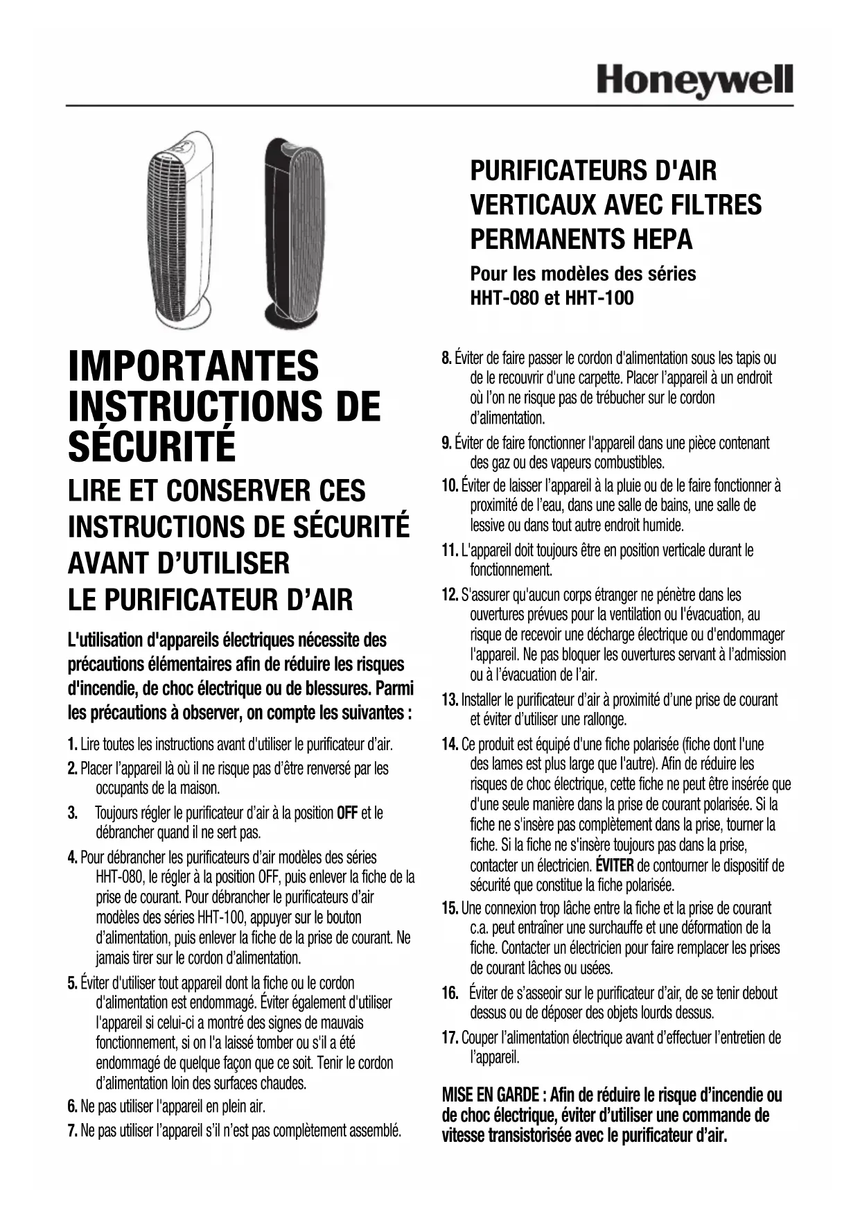 1. Lire toutes les instructions avant d'utiliser le purificateur d’air.