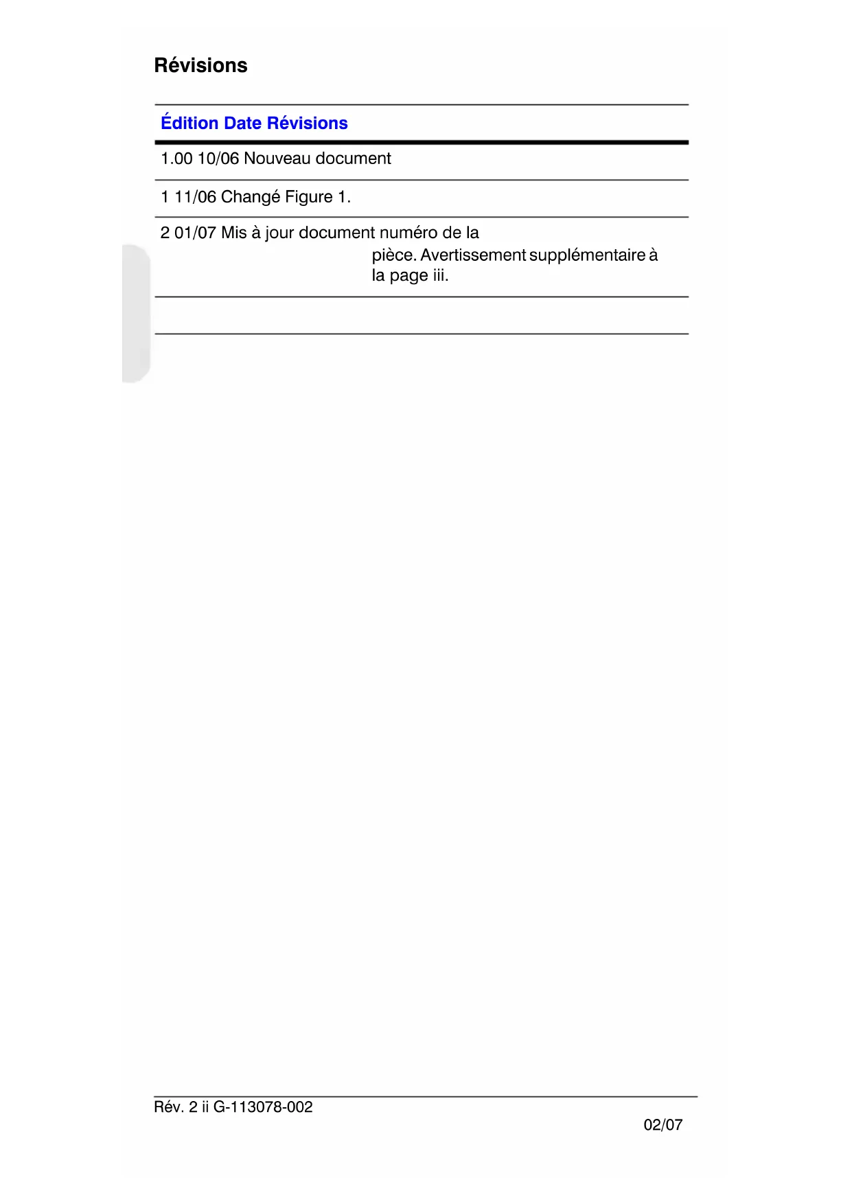 - 1 11/06 Changé Figure 1. 2 01/07 Mis à jour document numéro de la pièce. Avertissement supplémentaire à la page iii. Rév. 2 ii G-113078-002 02/07Rév. 2 iii G-113078-002 02/07 Avertissements L’installation et l’entretien ne doivent être effectués que par du personnel qualifié et expérimenté, afin de respecter toutes les normes locales et de maintenir votre garantie. DANGER ! Les modèles 12 VCC/24 VCA requièrent l’utilisation d’adaptateurs d’alimentation certifiés CSA/inscrits sur la liste UL, de classe 2, afin d’être en conformité avec les normes de sécurité électrique. Lorsque la prise du RÉSEAU D’ALIMENTATION ou une prise placée sur l’appareil est utilisée comme dispositif de déconnexion, ce dispositif doit demeuré aisément accessible. Déchets d'Équipements Électroniques et Électriques (DEEE). Élimination appropriée du produit (applicable en Union Européenne et dans d’autres pays européens pratiquant le tri sélectif). Ce produit doit être éliminé, à la fin de sa durée de vie utile, dans le respect des lois, réglementations et procédures locales applicables. Explication des symboles graphiques RISQUE DE CHOC ELECTRIQUE NE PAS OUVRIRATTENTION : POUR REDUIRE LE RISQUE DE CHOC ELECTRIQUE, NE PAS OTER LE CAPOT.AUCUNE PIECE N'EST REPARABLE PAR L'UTILISATEUR. LA MAINTENANCE NE DOIT ETRE EFFECTUEE QUE PAR UN PERSONNEL QUALIFIE.CE SYMBOLE SIGNALE LA PRÉSENCE DANS L’UNITÉ D’UNE TENSION DANGEREUSE CONSTITUANT UN RISQUE DE CHOC ÉLECTRIQUE.CE SYMBOLE INDIQUE QUE DES INSTRUCTIONS D'UTILISATION ET DE MAINTENANCE IMPORTANTES SONT FOURNIES AVEC CETTE UNITÉ. ATTENTION FrançaisRév. 2 iv G-113078-002 02/07 Déclaration de conformité FCC Informations à l’attention de l’utilisateur : Cet équipement a été testé et déclaré conforme aux normes définies pour un dispositif numérique de classe A. Conformément à l’article 15 de la Réglementation FCC, ces normes sont conçues pour fournir une protection suffisante contre le brouillage nuisible, lorsque l’équipement est utilisé dans un environnement commercial. Cet appareil génère, utilise et peut émettre de l'énergie de fréquence radio, et peut, en cas d'installation ou d'utilisation non conforme au manuel d'instructions, générer des interférences nuisibles aux communications radio. L'utilisation de ce produit dans une zone résidentielle peut provoquer des interférences nuisibles. Le cas échéant, l'utilisateur devra remédier à ces interférences à ses propres frais. Attention Tout changement ou toute modification non expressément approuvée par la partie responsable de la conformité peut annuler le droit de l'utilisateur à utiliser l'appareil. Déclaration de conformité du fabricant Le fabricant déclare que l’équipement fourni avec le présent guide est conforme aux exigences essentielles de sécurité de la directive de comptabilité électromagnétique EMC 89/336/EEC et de la directive de basse tension LVD 73/23 EEC, conformément aux exigences des normes EN 55013 sur les émissions.Rév. 2 G-113078-002 02/07 Français Sommaire Introduction p. 1