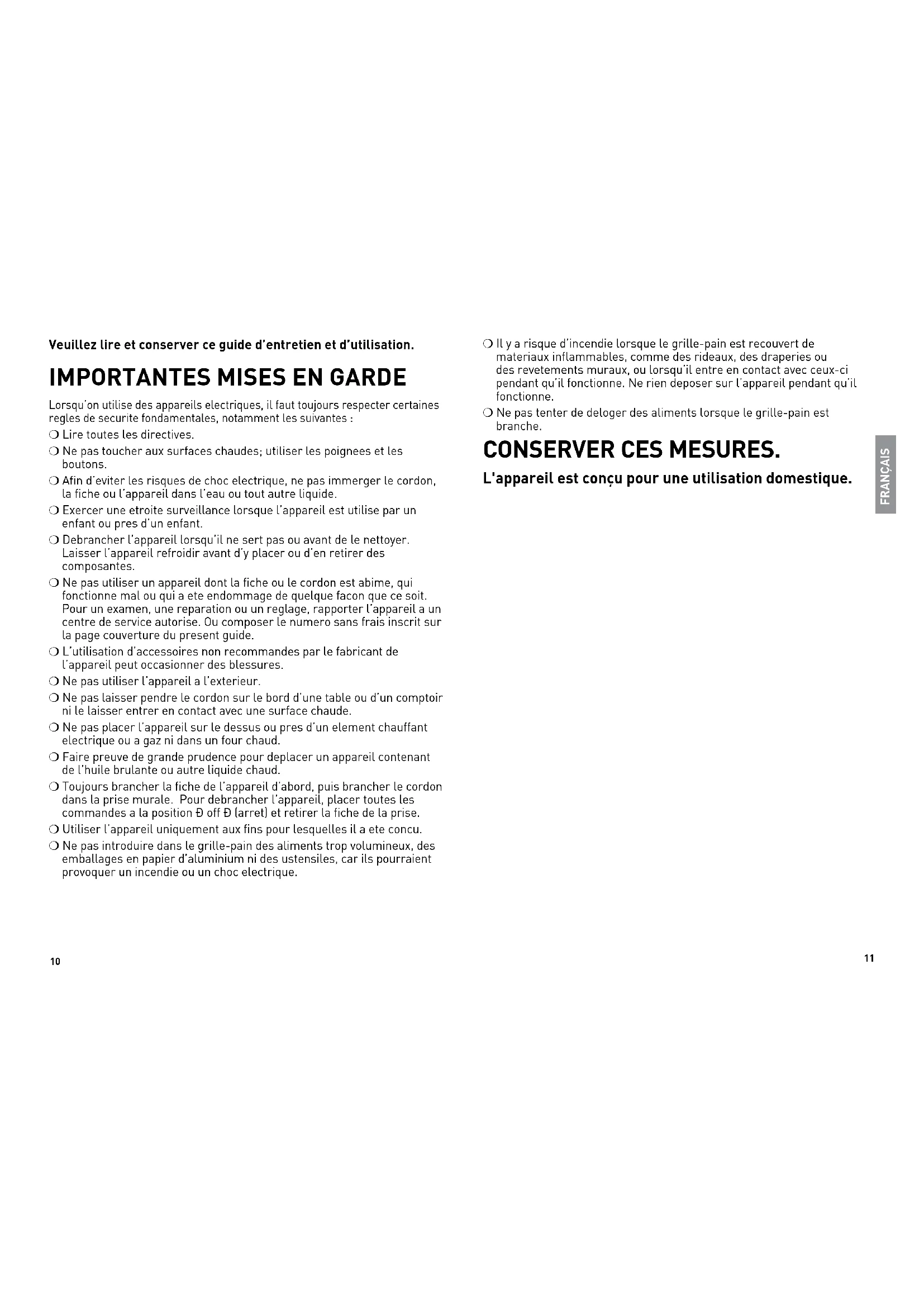 Lorsqu’on utilise des appareils electriques, il faut toujours respecter certaines regles de securite fondamentales, notamment les suivantes : ❍ Lire toutes les directives. ❍ Ne pas toucher aux surfaces chaudes; utiliser les poignees et les boutons. ❍ Afin d’eviter les risques de choc electrique, ne pas immerger le cordon, la fiche ou l’appareil dans l’eau ou tout autre liquide. ❍ Exercer une etroite surveillance lorsque l’appareil est utilise par un enfant ou pres d’un enfant. ❍ Debrancher l’appareil lorsqu’il ne sert pas ou avant de le nettoyer. Laisser l’appareil refroidir avant d’y placer ou d’en retirer des composantes. ❍ Ne pas utiliser un appareil dont la fiche ou le cordon est abime, qui fonctionne mal ou qui a ete endommage de quelque facon que ce soit. Pour un examen, une reparation ou un reglage, rapporter l’appareil a un centre de service autorise. Ou composer le numero sans frais inscrit sur la page couverture du present guide. ❍ L’utilisation d’accessoires non recommandes par le fabricant de l’appareil peut occasionner des blessures. ❍ Ne pas utiliser l’appareil a l’exterieur. ❍ Ne pas laisser pendre le cordon sur le bord d’une table ou d’un comptoir ni le laisser entrer en contact avec une surface chaude. ❍ Ne pas placer l’appareil sur le dessus ou pres d’un element chauffant electrique ou a gaz ni dans un four chaud. ❍ Faire preuve de grande prudence pour deplacer un appareil contenant de l’huile brulante ou autre liquide chaud. ❍ Toujours brancher la fiche de l’appareil d’abord, puis brancher le cordon dans la prise murale. Pour debrancher l’appareil, placer toutes les commandes a la position ≪ off ≪ (arret) et retirer la fiche de la prise. ❍ Utiliser l’appareil uniquement aux fins pour lesquelles il a ete concu. ❍ Ne pas introduire dans le grille-pain des aliments trop volumineux, des emballages en papier d’aluminium ni des ustensiles, car ils pourraient provoquer un incendie ou un choc electrique. ❍ Il y a risque d’incendie lorsque le grille-pain est recouvert de materiaux inflammables, comme des rideaux, des draperies ou des revetements muraux, ou lorsqu’il entre en contact avec ceux-ci pendant qu’il fonctionne. Ne rien deposer sur l’appareil pendant qu’il fonctionne. ❍ Ne pas tenter de deloger des aliments lorsque le grille-pain est branche. CONSERVER CES MESURES. L'appareil est conçu pour une utilisation domestique. FRANÇAIS12