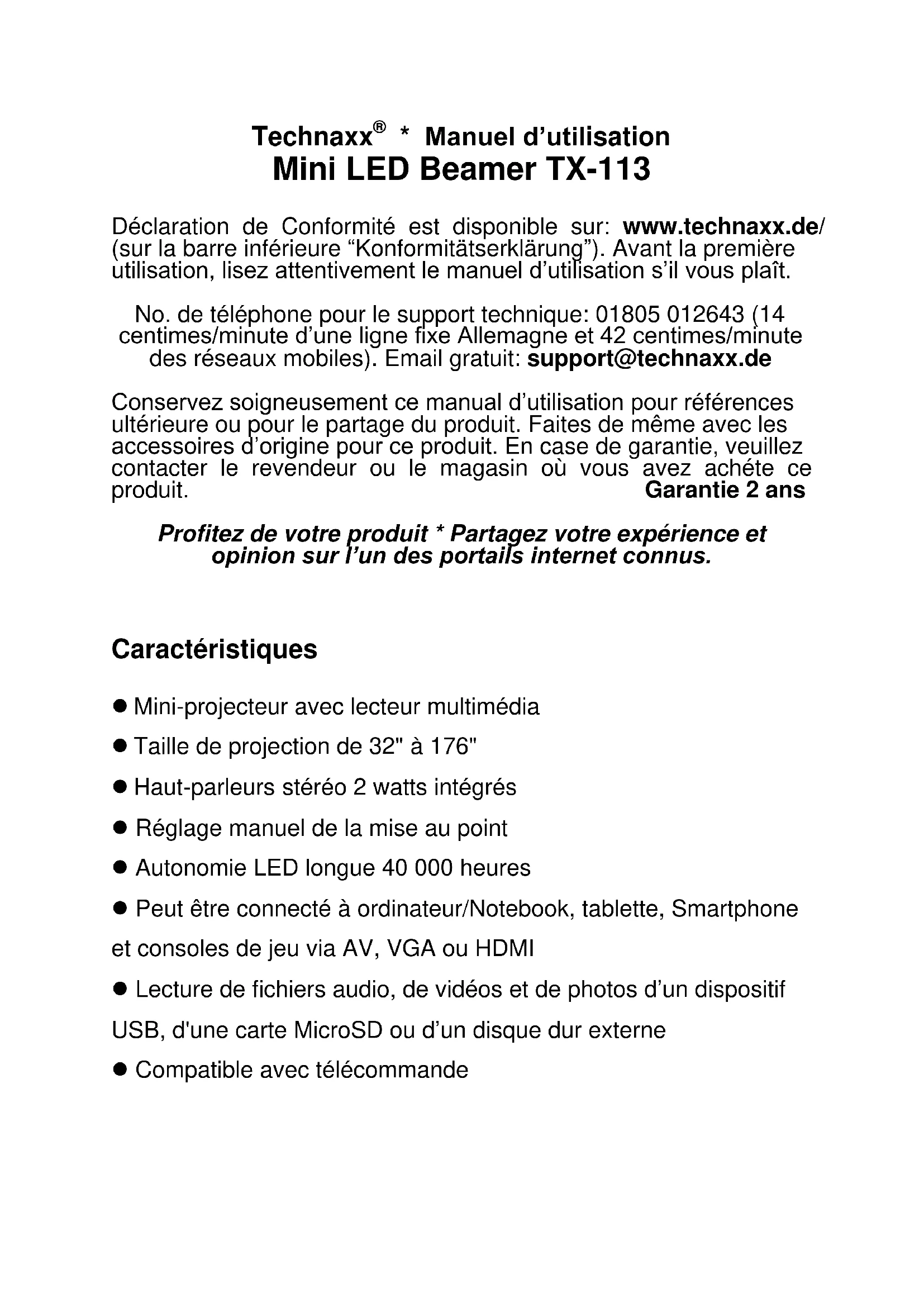 - Manuel d’utilisation Mini LED Beamer TX-113 Déclaration de Conformité est disponible sur: www.technaxx.de/ (sur la barre inférieure “Konformitätserklärung”). Avant la première utilisation, lisez attentivement le manuel d’utilisation s’il vous plaît. No. de téléphone pour le support technique: 01805 012643 (14 centimes/minute d’une ligne fixe Allemagne et 42 centimes/minute des réseaux mobiles). Email gratuit: support@technaxx.de Conservez soigneusement ce manual d’utilisation pour références ultérieure ou pour le partage du produit. Faites de même avec les accessoires d’origine pour ce produit. En case de garantie, veuillez contacter le revendeur ou le magasin où vous avez achéte ce produit. Garantie 2 ans Profitez de votre produit * Partagez votre expérience et opinion sur l’un des portails internet connus.