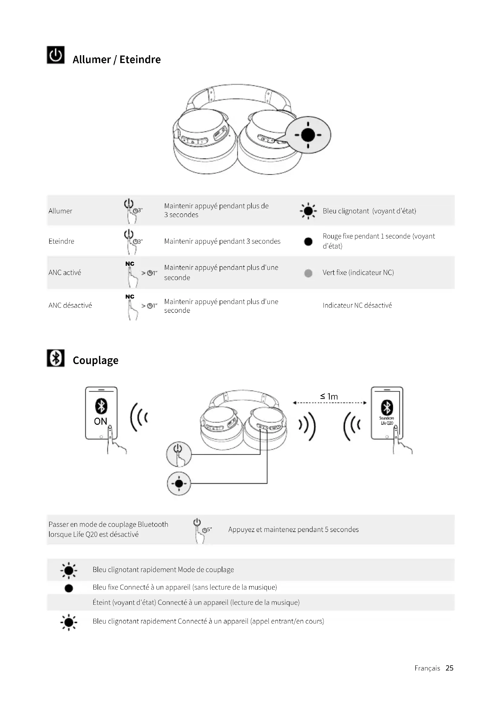 ≤ 1m Soundcore Life Q20 Passer en mode de couplage Bluetooth lorsque Life Q20 est désactivé