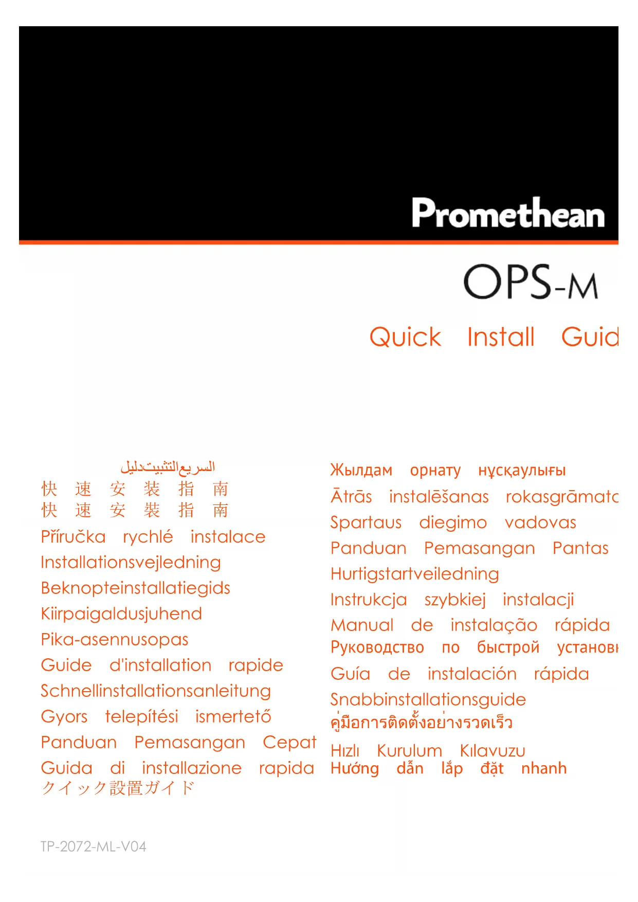 Promethean Limited vakuuttaa, että OPS2-5P8R256S vastaa olennaisilta osin seuraavien Euroopan unionin direktiivien vaatimuksia: radiolaitedirektiivi 2014/53/EU, sähkömagneettista yhteensopivuutta koskeva direktiivi 2014/30/EU, pienjännitedirektiivi 2014/35/EU ja RoHS-direktiivi 2011/65/EU. Täydellinen yhdenmukaisuusilmoitus löytyy hakusanalla TP-2084 osoitteesta https://support.prometheanworld.com. Tyyppi Taajuus (MHz) Enimmäisteho (dBm) BT 2 400-2 483,4 10 Wi-Fi 2 400-2 483,4 20 Wi-Fi 5 150-5 720 20 Wi-Fi 5 725-5 825 14 49 OPS-M Quick Install GuideOPS2-5P4R500H on tarkoitettu vain sisäiseen käyttöön. OPS2-5P8R256S on tarkoitettu vain sisäiseen käyttöön. Laitteet ovat RF-normien mukaisia, kun niitä käytetään 20cm:n etäisyydellä kehosta. Promethean Ltd, Promethean House, Lower Phillips Road, Blackburn, Lancashire, BB1 5TH, Yhdistynyt kuningaskunta Conformité Europe Nous soussignés, PrometheanLimited, déclarons sous notre entière responsabilité que le dispositif OPS2-5P4R500H est conforme aux conditions essentielles de la directive 2014/53/UE sur les équipements Radio (RED), la directive 2014/30/UE sur la compatibilité électromagnétique (CEM), la directive 2014/35/UE Basse Tension et la directive 2011/65/UE sur la restriction des substances dangereuses dans les équipements électriques et électroniques. La déclaration de conformité complète est disponible à l'adresse https://support.prometheanworld.com en cherchant TP-2083. Nous soussignés, PrometheanLimited, déclarons sous notre entière responsabilité que le dispositif OPS2-5P8R256S est conforme aux conditions essentielles de la directive 2014/53/UE sur les équipements Radio (RED), la directive 2014/30/UE sur la compatibilité électromagnétique (CEM), la directive 2014/35/UE Basse Tension et la directive 2011/65/UE sur la restriction des substances dangereuses dans les équipements électriques et électroniques. La déclaration de conformité complète est disponible à l'adresse https://support.prometheanworld.com en cherchant TP-2084. AVERTISSEMENT Les produits OPS2-5P4R500H et OPS2-5P8R256S sont de classeB. Dans un environnement domestique, ce type de produit peut causer des interférences, auquel cas l'utilisateur devra prendre les mesures nécessaires. Déchets des équipements électriques et électroniques (DEEE) Pour en savoir plus sur la procédure de mise au rebut de ces produits, veuillez contacter votre revendeur Promethean. Les produits OPS2-5P4R500H et OPS2-5P8R256S comportent un moduleWi-Fi Europe OPS-M Quick Install Guide 50OPS2-5P4R500H Nous soussignés, PrometheanLimited, déclarons sous notre entière responsabilité que le dispositif OPS2-5P4R500H est conforme aux conditions essentielles de la directive 2014/53/UE sur les équipements Radio (RED), la directive 2014/30/UE sur la compatibilité électromagnétique (CEM), la directive 2014/35/UE Basse Tension et la directive 2011/65/UE sur la restriction des substances dangereuses dans les équipements électriques et électroniques. La déclaration de conformité complète est disponible à l'adresse https://support.prometheanworld.com en cherchant TP-2083. Type Fréquence (MHz) Puissance max. (dBm) BT 2400-2483,4 10 Wi-Fi 2400-2483,4 20 Wi-Fi 5150-5725 20 Wi-Fi 5725-5825 14