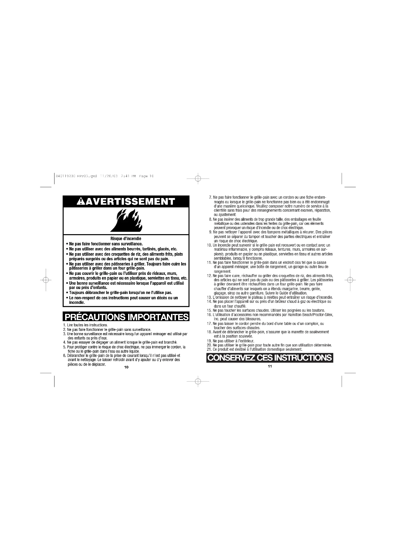 In the U.S. 1-800-851-8900 In Canada 1-800-267-2826 Web site address: www.hamiltonbeach.com or www.proctorsilex.com KEEP THESE NUMBERS FOR FUTURE REFERENCE! 840119200 ENv03.qxd 11/20/03 2:43 PM Page 87. Ne pas faire fonctionner le grille-pain avec un cordon ou une fiche endom- magés ou lorsque le grille-pain ne fonctionne pas bien ou a été endommagé d’une manière quelconque. Veuillez composer notre numéro de service à la clientèle sans frais pour des renseignements concernant examen, réparation, ou ajustement.