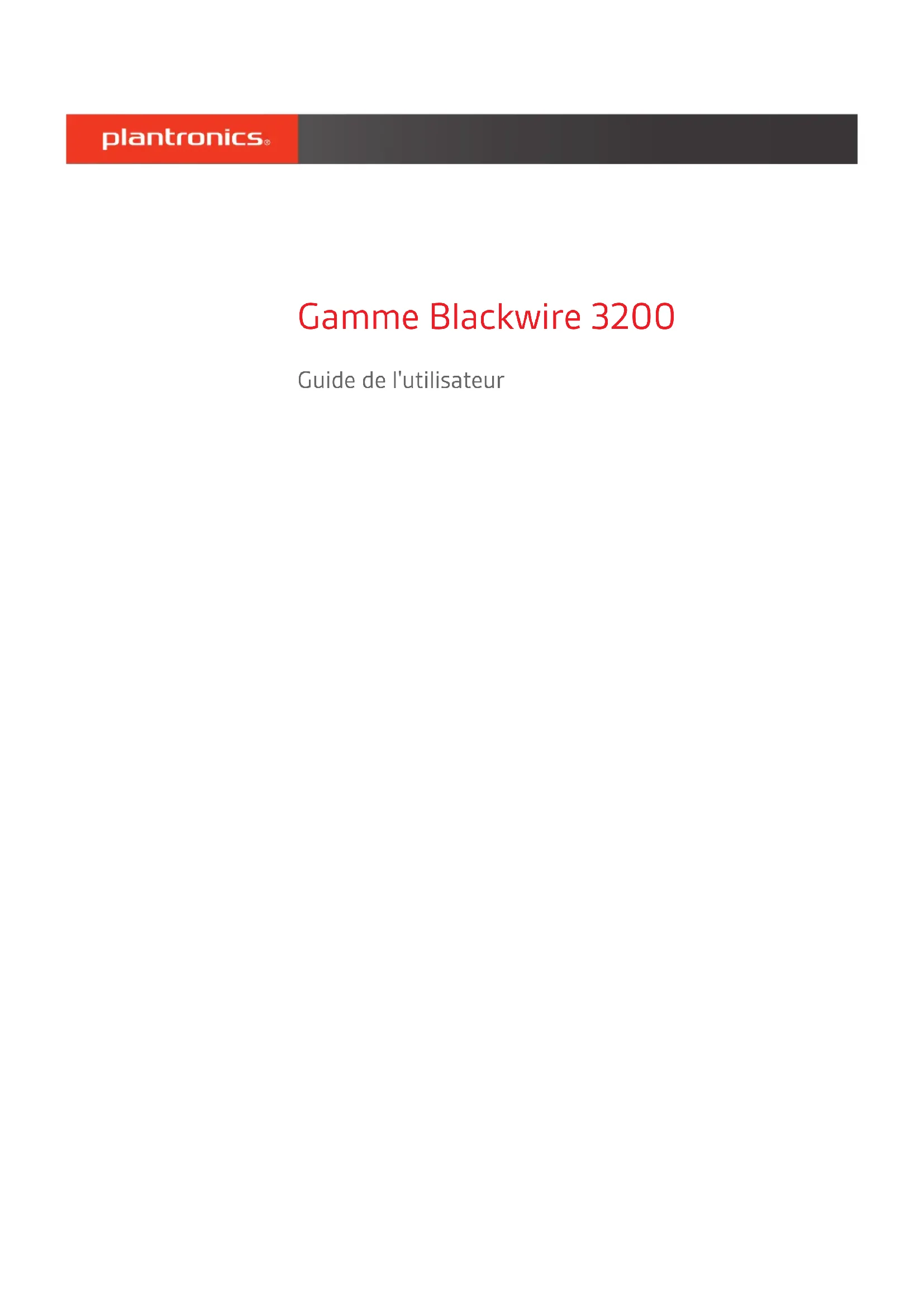 Gamme Blackwire 3200 Guide de l'utilisateurSommaire Présentation 3 Installation 4 Charger le logiciel 4 Port 5 Ajuster le serre-tête 5 Positionner la perche 5 Régler la perche 5 Utilisez la commande sur le cordon 6 Passer/prendre/terminer des appels 6 Volume 6 Mode secret 6 Dépannage 7 Micro-casque 7 Assistance 8 2Icônes Commandes sur cordon VOYANTS LED Fonction Bouton d'appel Vert clignotant Appel entrant Voyant vert fixe En appel Bouton d'augmentation du volume Augmente le volume d'écoute Bouton de diminution du volume Réduit le volume d'écoute Touche secret Rouge Le son de l'oreillette est coupé Présentation 3Allumez votre micro-casque en le connectant à un ordinateur ou à un périphérique mobile. Vous pouvez connecter votre micro-casque de deux façons : 1 Via un connecteur USB-A/USB-C REMARQUE La fonctionnalité de contrôle d'appel du micro-casque peut varier selon les périphériques mobiles. 2 Via un connecteur 3,5 mm* REMARQUE La fonction de contrôle d'appel n'est pas disponible sur ce micro-casque. *Connecteur 3,5 mm disponible uniquement sur les modèles Blackwire 3215/3225. IMPORTANT Certains softphones nécessitent l'installation de Plantronics Hub pour Windows ou Mac afin d'activer la fonctionnalité de contrôle d'appel (répondre/mettre fin à un appel et mode secret) sur le micro-casque. Téléchargez Plantronics Hub pour Windows/Mac sur plantronics.com/software. Gérez les paramètres de votre micro-casque sur votre ordinateur avec Plantronics Hub :