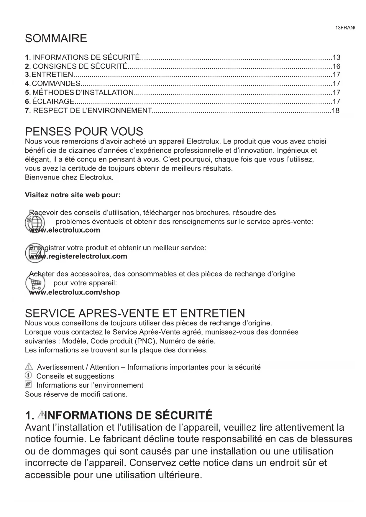 Avant l’installation et l’utilisation de l’appareil, veuillez lire attentivement la notice fournie. Le fabricant décline toute responsabilité en cas de blessures ou de dommages qui sont causés par une installation ou une utilisation incorrecte de l’appareil. Conservez cette notice dans un endroit sûr et accessible pour une utilisation ultérieure.14 www.electrolux.com