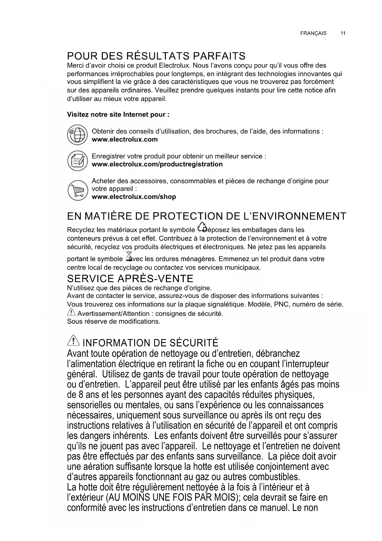 Avant toute opération de nettoyage ou d’entretien, débranchez l’alimentation électrique en retirant la che ou en coupant l’interrupteur général. Utilisez de gants de travail pour toute opération de nettoyage ou d’entretien. L’appareil peut être utilisé par les enfants âgés pas moins de 8 ans et les personnes ayant des capacités réduites physiques, sensorielles ou mentales, ou sans l’expérience ou les connaissances nécessaires, uniquement sous surveillance ou après ils ont reçu des instructions relatives à l’utilisation en sécurité de l’appareil et ont compris les dangers inhérents. Les enfants doivent être surveillés pour s’assurer qu’ils ne jouent pas avec l’appareil. Le nettoyage et l’entretien ne doivent pas être effectués par des enfants sans surveillance. La pièce doit avoir une aération sufsante lorsque la hotte est utilisée conjointement avec d’autres appareils fonctionnant au gaz ou autres combustibles. La hotte doit être régulièrement nettoyée à la fois à l’intérieur et à l’extérieur (AU MOINS UNE FOIS PAR MOIS); cela devrait se faire en conformité avec les instructions d’entretien dans ce manuel. Le non FR MANUEL D’UTILISATIONwww.electrolux.com