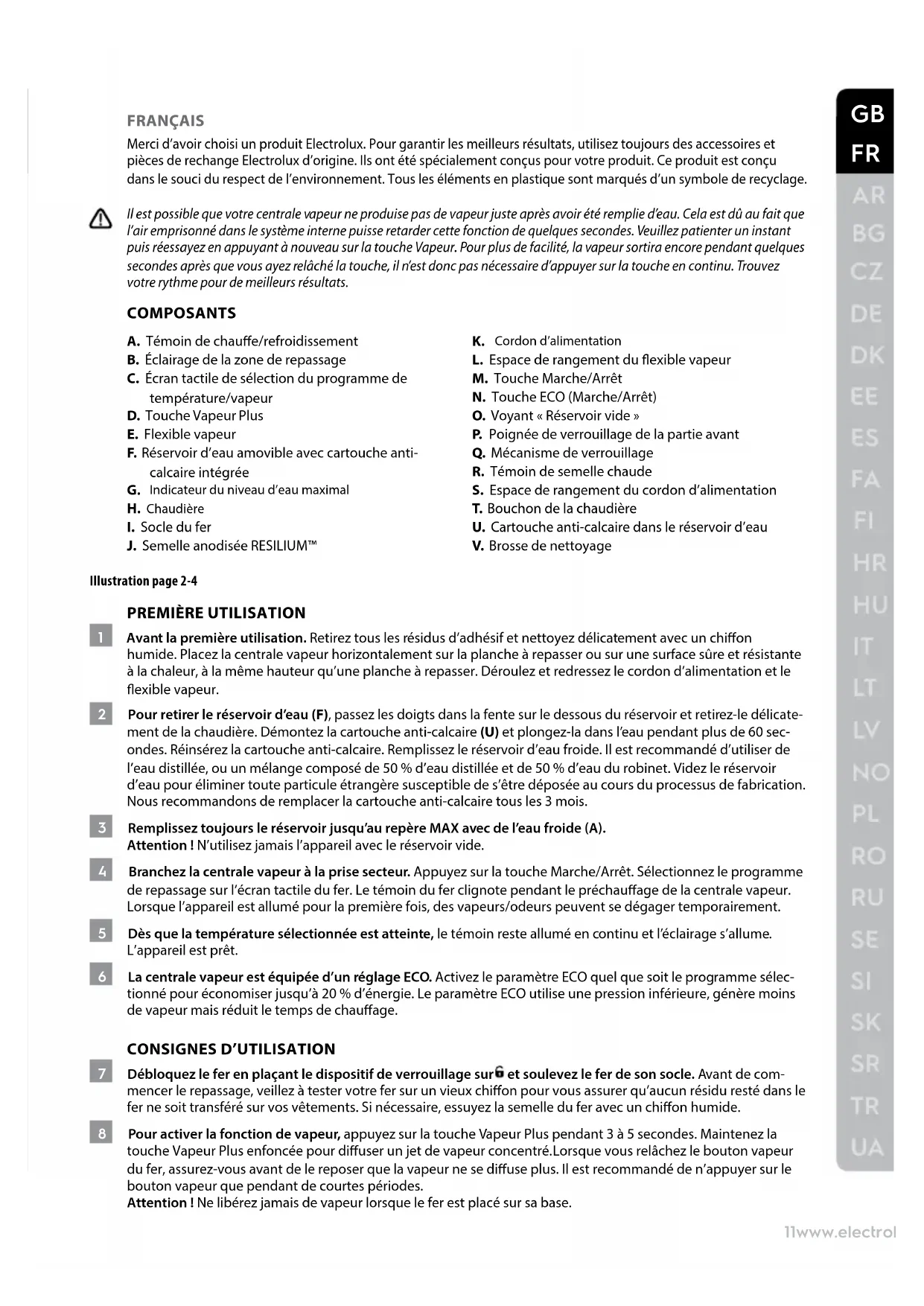 FRANÇAIS Merci d’avoir choisi un produit Electrolux. Pour garantir les meilleurs résultats, utilisez toujours des accessoires et pièces de rechange Electrolux d’origine. Ils ont été spécialement conçus pour votre produit. Ce produit est conçu dans le souci du respect de l’environnement. Tous les éléments en plastique sont marqués d’un symbole de recyclage. Il est possible que votre centrale vapeur ne produise pas de vapeur juste après avoir été remplie d’eau. Cela est dû au fait que l’air emprisonné dans le système interne puisse retarder cette fonction de quelques secondes. Veuillez patienter un instant puis réessayez en appuyant à nouveau sur la touche Vapeur. Pour plus de facilité, la vapeur sortira encore pendant quelques secondes après que vous ayez relâché la touche, il n’est donc pas nécessaire d’appuyer sur la touche en continu. Trouvez votre rythme pour de meilleurs résultats. COMPOSANTS A. Témoin de chaue/refroidissement B. Éclairage de la zone de repassage C. Écran tactile de sélection du programme de température/vapeur D. Touche Vapeur Plus E. Flexible vapeur F. Réservoir d’eau amovible avec cartouche anti- calcaire intégrée