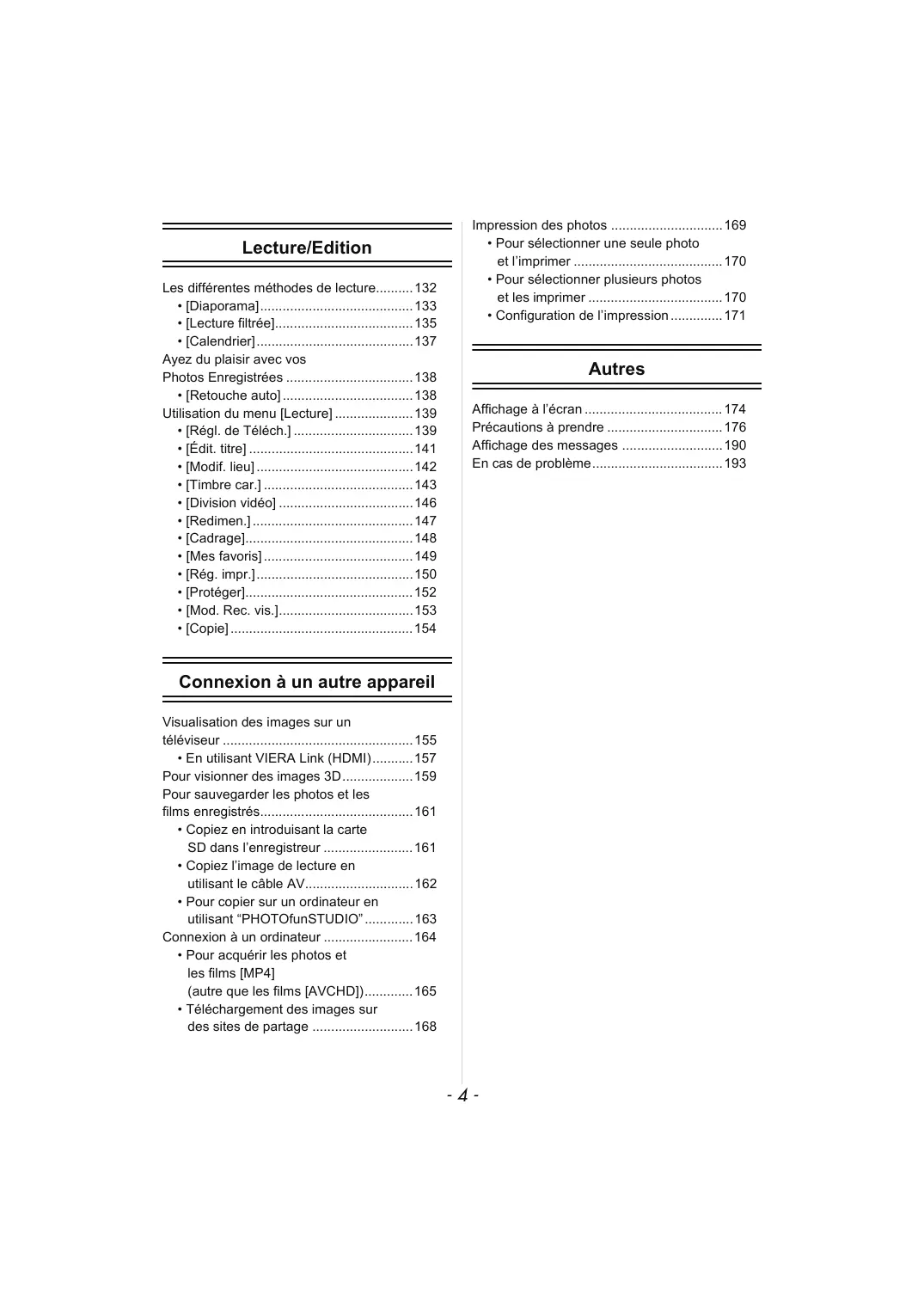 - Configuration de l’impression .............. 171 Autres Affichage à l’écran ..................................... 174 Précautions à prendre ............................... 176 Affichage des messages ...........................190 En cas de problème...................................193 Connexion à un autre appareil Visualisation des images sur un téléviseur ...................................................155