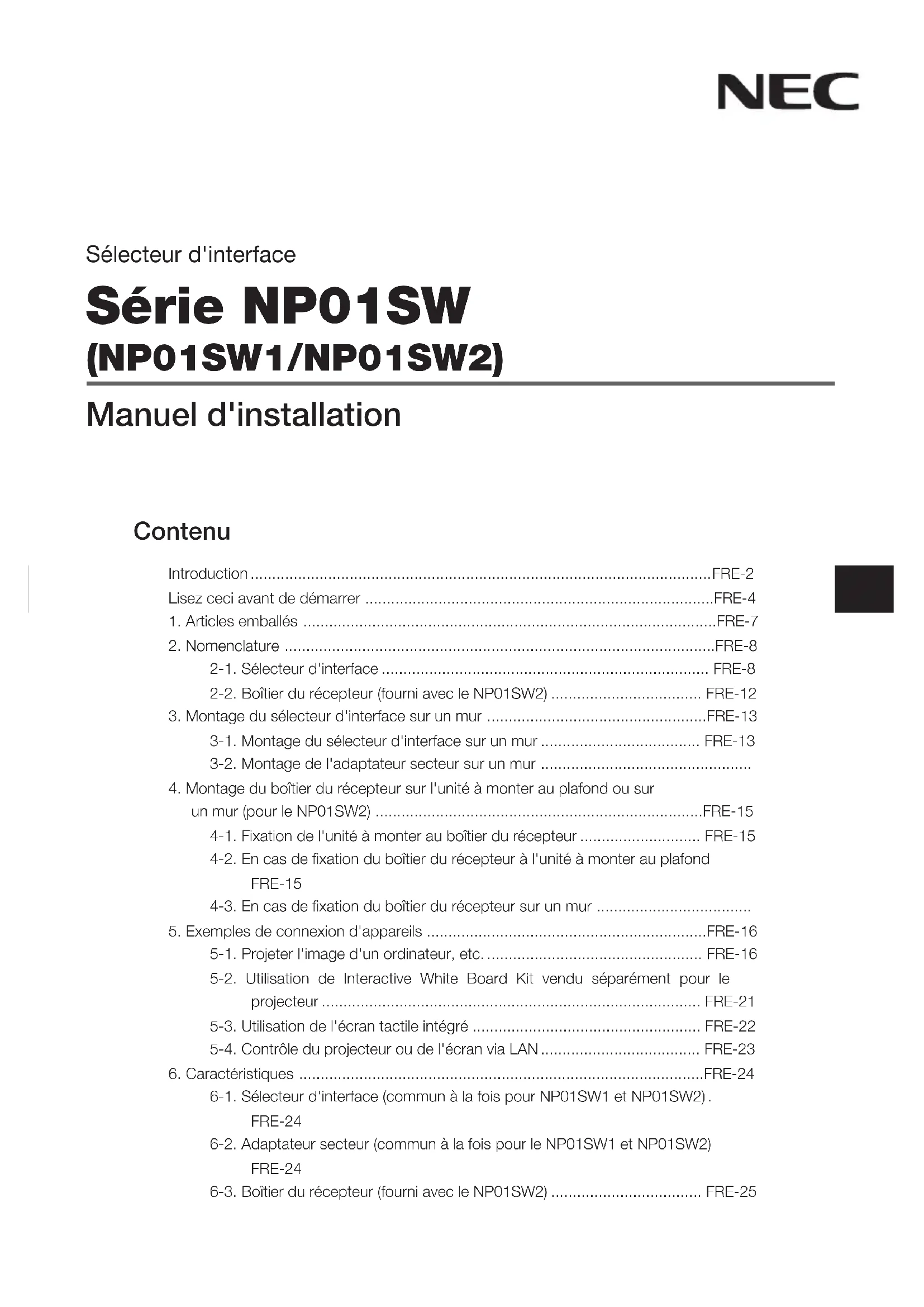 Température de stockage -10 - 50°C Humidité de stockage 20 - 80% (sans condensation) *1 Définition de HDCP et de la technologie HDCP HDCP est l'abréviation de « High-bandwidth Digital Content Protection », un système de protection des droits d'auteur dont le but est d'empêcher la copie illicite de contenus numériques envoyés via DisplayPort ou interface HDMI. Les normes HDCP sont établies et gérées par un groupe appelé Digital Content Protection, LLC. Sur ce produit, la technologie HDCP est utilisée pour la borne d'entrée HDMI et le port HDBaseT. Les contenus numériques qui sont protégés par les droits d'auteur en utilisant la technologie HDCP peuvent être projetés à l'aide de la borne d'entrée HDMI et du port HDBaseT de ce produit. Cependant, les images du port d'entrée HDMI ou du port HDBaseT peuvent ne pas s'afficher en raison des changements apportés aux normes HDCP et pour d'autres raisons, même si ce produit fonctionne correctement. *2 Le port LAN de ce produit ne prend pas en charge PoE. Le raccordement du port LAN de ce produit à un réseau fournissant une puissance électrique peut entraîner des dommages ou une combustion. *3 Utilisez un câble LAN disponible dans le commerce du type décrit ci-dessous pour la connexion au port HDBaseT. État Longueur de câble Spécification du câble Non connecté au boîtier du récepteur Max. 100 m (pour les signaux 4K, maximum 70 m) CAT5e ou câble STP supérieur Épaisseur recommandée AWG23 Connecté au boîtier du récep- teur Max. 30 m CAT6A ou câble STP supérieur Épaisseur recommandée AWG23 REMARQUE : La performance peut ne pas être satisfaisante avec certains câbles.FRE-26 *4 Le signal 1080p prend en charge des signaux jusqu'à 8 bit. D'autre part, les signaux tels que 1080i, 720p, 480p, et 480i, etc., prennent en charge des signaux jusqu'à 12 bit. *5 Ne prend pas en charge les signaux dépassant 1080p 30 Hz et 1080i 60 Hz, etc.Selettore di interfaccia Serie NP01SW (NP01SW1/NP01SW2) Manuale di installazione Introduzione ................................................................................................ITA-2Leggere prima di utilizzare ..........................................................................ITA-41. Prodotti confezionati ...............................................................................ITA-72. Nomi dei componenti .............................................................................ITA-82-1. Selettore di interfaccia ................................................................ITA-82-2. Ricevitore (incluso con NP01SW2) ............................................ITA-123. Montaggio del selettore di interfaccia su una parete ..............................ITA-133-1. Montaggio del selettore di interfaccia su una parete ..................ITA-133-2. Montaggio delladattatore CA su una parete ...........................ITA-144. Montaggio del ricevitore sullunità di montaggio sul soffitto o su una parete (per NP01SW2) ..................................................................ITA-154-1. Fissaggio delunità di montaggio al ricevitore ..........................ITA-154-2. In caso di fissaggio del ricevitore sullunità di montaggio a sof-fitto..........................................................................................ITA 4-3. In caso di fissaggio del ricevitore su una parete ........................ITA-155. Esempi di collegamento del dispositivo .................................................ITA-165-1. Proiezione dellimmagine di un computer, ecc. .......................ITA-165-2. Utilizzo di un kit lavagna interattiva venduto separatamente per il pro iettore.................................................................................ITA-215-3. Utilizzo del display touch integrato ............................................ITA-225-4. Controllo del proiettore o dello schermo tramite LAN ................ITA-236. Specifiche .............................................................................................ITA-246-1. Selettore di interfaccia (comune per NP01SW1 e NP01SW2) ...ITA-246-2. Adattatore CA (comune per NP01SW1 e NP01SW2) ................ITA-246-3. Ricevitore (incluso con NP01SW2) ............................................ITA-25 IndiceITA-2 Introduzione Grazie per aver acquistato il selettore di interfaccia NEC della serie NP01SW (NP01SW1/NP01SW2). QuestoprodottoèdotatodivariterminalidiingressoediunterminalediuscitaHDBaseT. Utilizzandoquestoprodottoèmoltosemplicecollegarediversidispositiviconilnostroproiettoreoscher- mo in una classe o in una sala riunioni. Il ricevitore viene fornito con il selettore di interfaccia per NP- 01SW2.