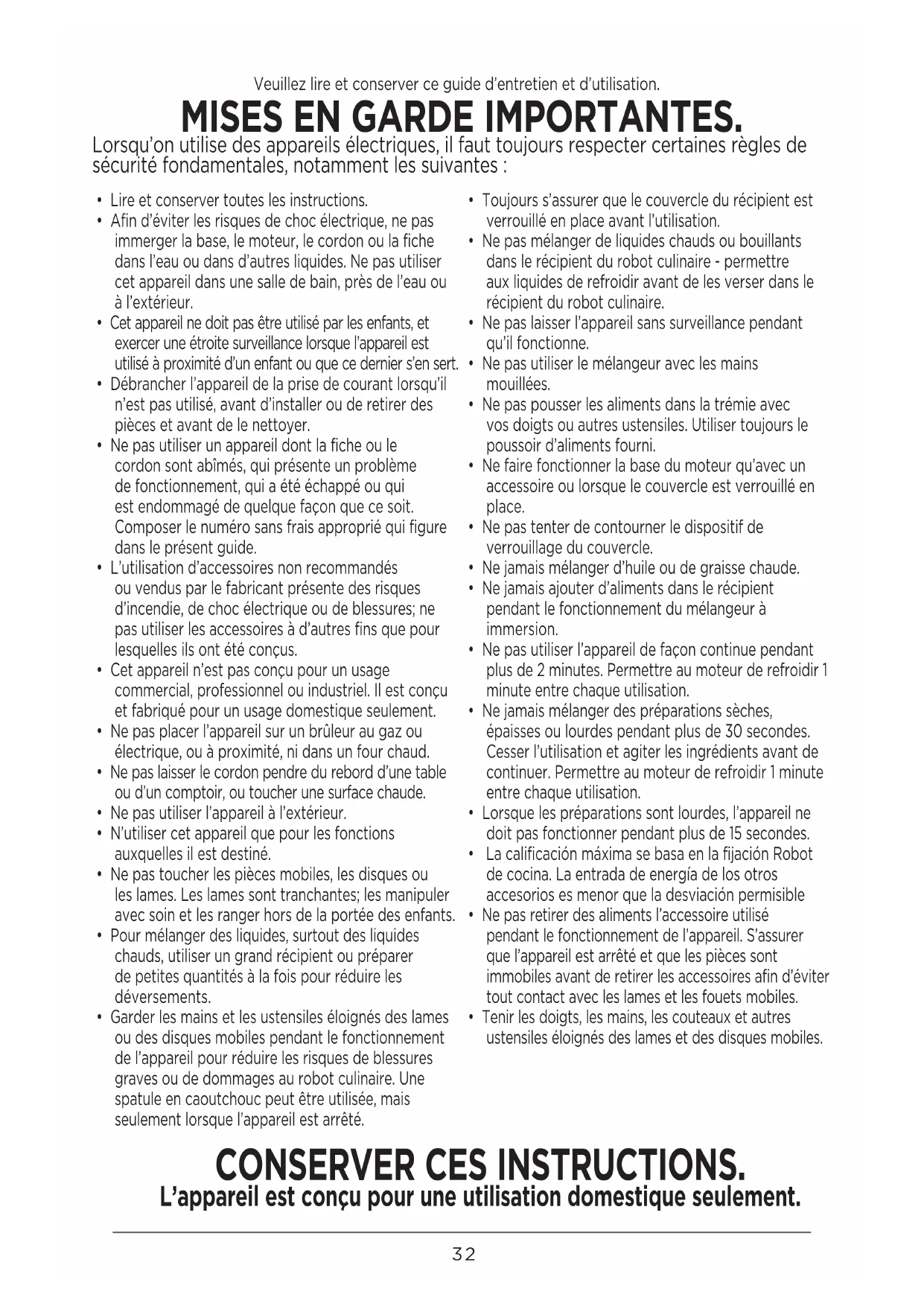 - Garder les mains et les ustensiles éloignés des lames ou des disques mobiles pendant le fonctionnement de l’appareil pour réduire les risques de blessures graves ou de dommages au robot culinaire. Une spatule en caoutchouc peut être utilisée, mais seulement lorsque l’appareil est arrêté.