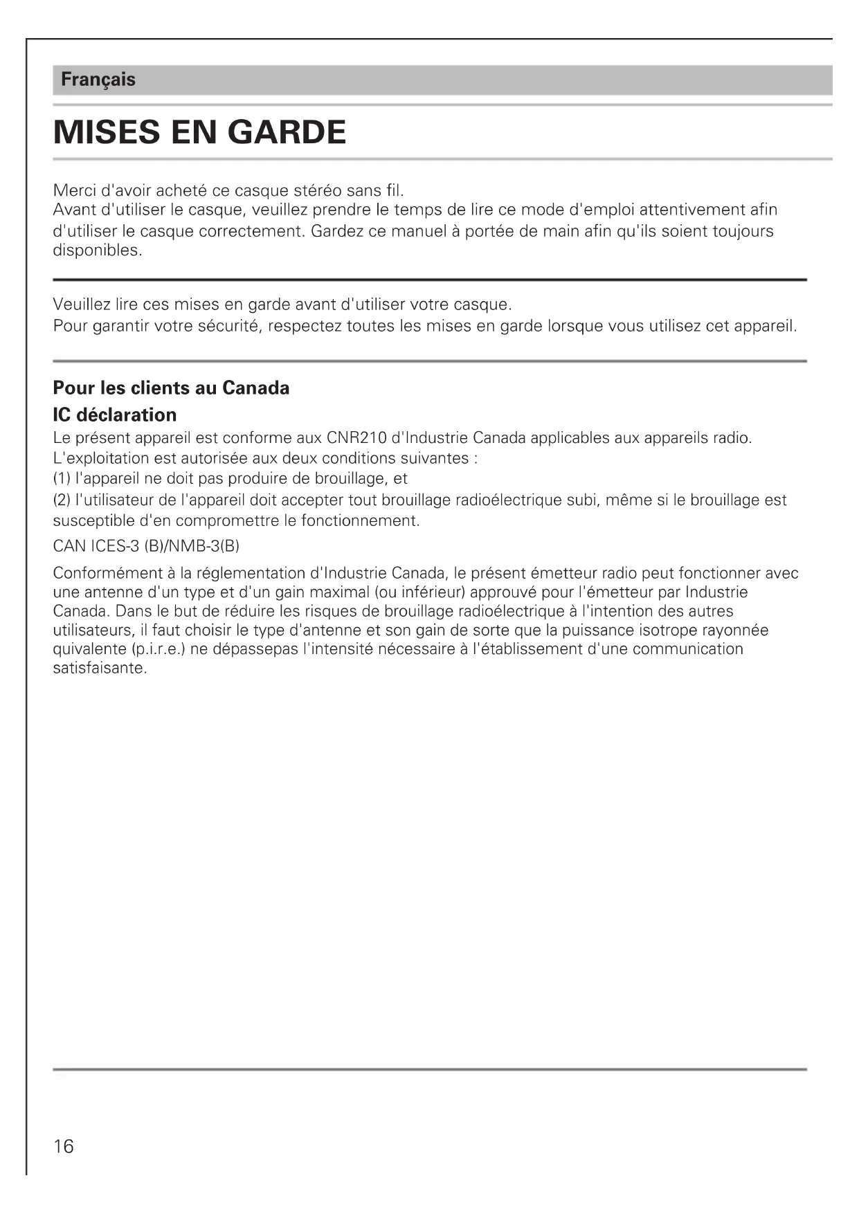 Français Veuillez lire ces mises en garde avant d'utiliser votre casque. Pour garantir votre sécurité, respectez toutes les mises en garde lorsque vous utilisez cet appareil. Merci d'avoir acheté ce casque stéréo sans l. Avant d'utiliser le casque, veuillez prendre le temps de lire ce mode d'emploi attentivement an d'utiliser le casque correctement. Gardez ce manuel à portée de main an qu'ils soient toujours disponibles.