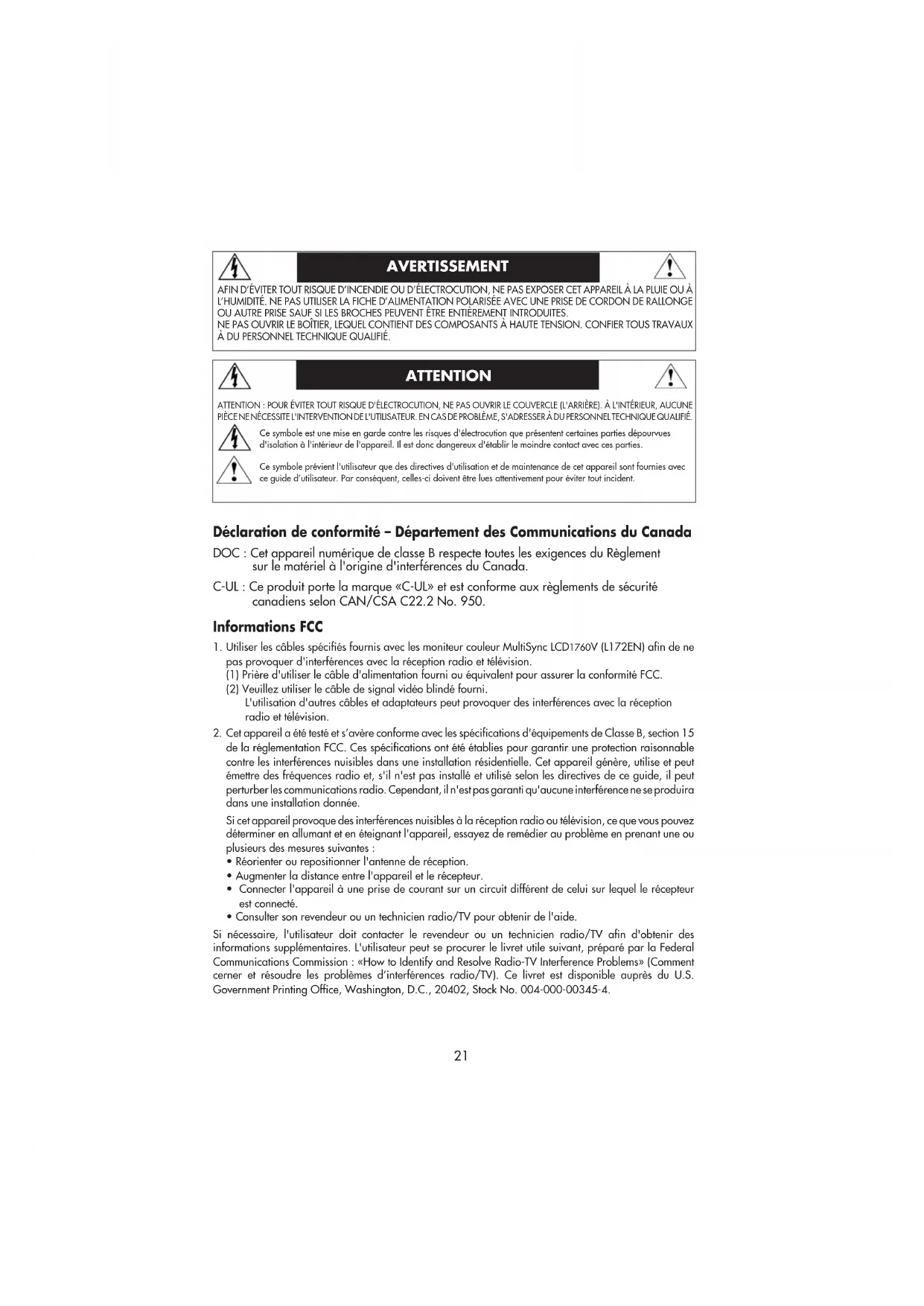 - Consulter son revendeur ou un technicien radio/TV pour obtenir de l'aide. Si nécessaire, l'utilisateur doit contacter le revendeur ou un technicien radio/TV afin d'obtenir des informations supplémentaires. L'utilisateur peut se procurer le livret utile suivant, préparé par la Federal Communications Commission : «How to Identify and Resolve Radio-TV Interference Problems» (Comment cerner et résoudre les problèmes d’interférences radio/TV). Ce livret est disponible auprès du U.S. Government Printing Office, Washington, D.C., 20402, Stock No. 004-000-00345-4.22 La boîte* de votre nouveau moniteur NEC MultiSync