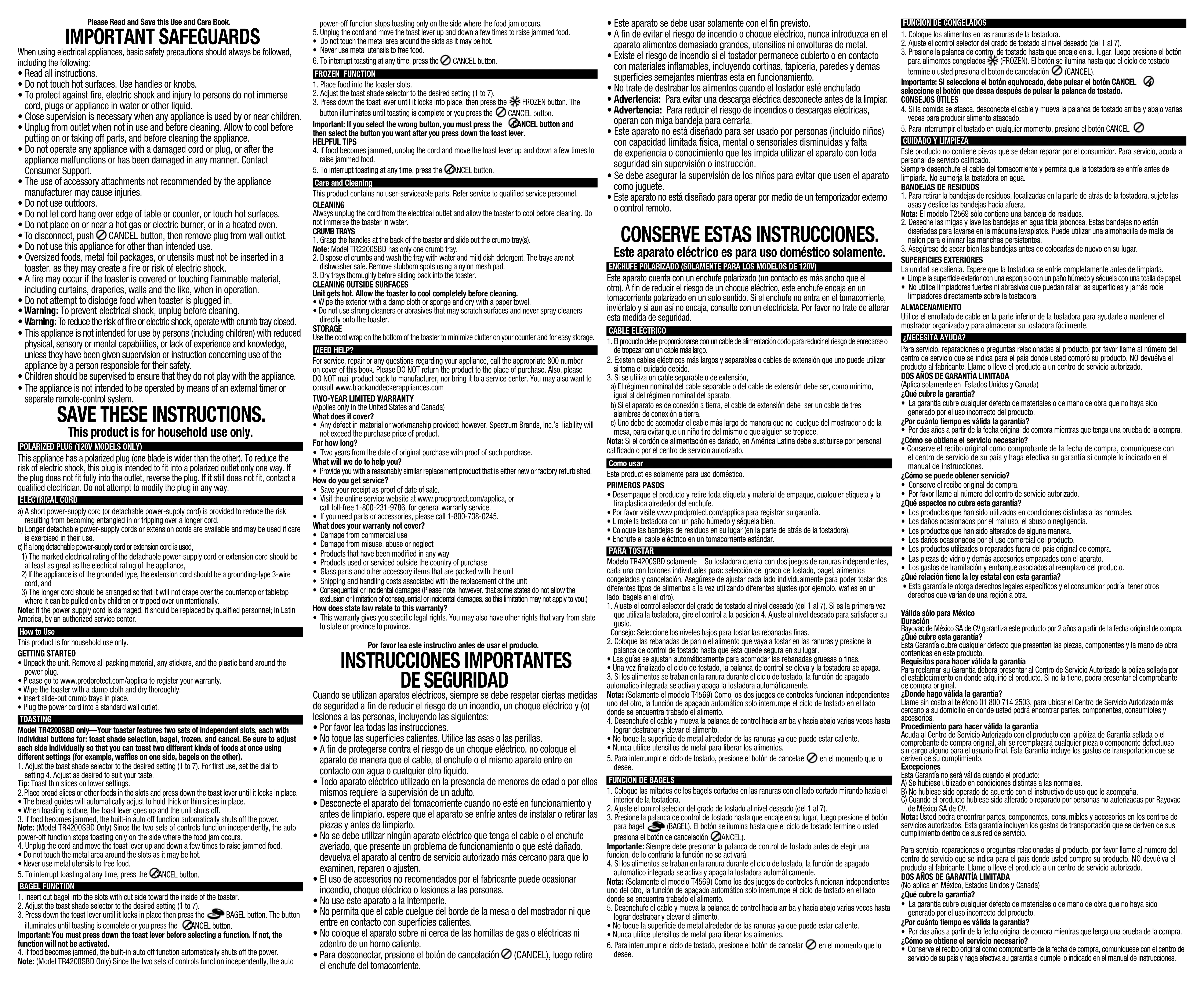- On peut également communiquer avec le service des pièces et des accessoires au 1 800 738-0245. Qu’est-ce que la garantie ne couvre pas?• Des dommages dus à une utilisation commerciale.• Des dommages causés par une mauvaise utilisation ou de la négligence.• Des produits qui ont été modifiés.• Des produits utilisés ou entretenus hors du pays où ils ont été achetés.• Des pièces en verre et tout autre accessoire emballés avec le produit.• Les frais de transport et de manutention reliés au remplacement du produit.• Des dommages indirects (il faut toutefois prendre note que certains états ne permettent pas l’exclusion ni la limitation des dommages indirects). Quelles lois régissent la garantie?Les modalités de la présente garantie donnent des droits légaux spécifiques. L’utilisateur peut égale ment se prévaloir d’autres droits selon l’état ou la province qu’il habite.2/4 SLICE TOASTERSProduct may vary slightly from what is illustrated. 1. Extra-wide slots with automatic adjusting guides 2. Toast lever 3. BAGEL button 4. FROZEN button 5. CANCEL button 6. Toast shade selector dial† 7. Removable slide-out crumb trays (not shown) Model TR2200SBD, (Part# TR2200-01) Model TR4200SBD, viewing from the back side of the unit: Left (Part# TR4200-01), Right (Part# TR4200-02) 8. Cord wrap (under unit)Note: † indicates consumer replaceable/removable partsTOSTADOR DE PAN PARA 2/4 REBANADASEl producto puede variar ligeramente del que aparece ilustrado aquí. 1. Ranuras anchas con guías auto-ajustables 2. Palanca de control de tostado 3. Botón para bagels 4. Botón para congelados 5. Botón de cancelación 6. Selectors de nivel de tostado † 7. Extraíble bandeja deslizante para migas (no se muestra) Modelo TR2200SBD, (pieza no. TR2200-01) Modelo TR4200SBD, mirando desde la parte posterior de la unidad: izquierda (pieza no. TR4200-01), derecha (pieza no. TR4200-02) 8. Para enrollar el cable (en la unidad)Nota: † indica las piezas extraíbles o reemplazables por parte del consumidor