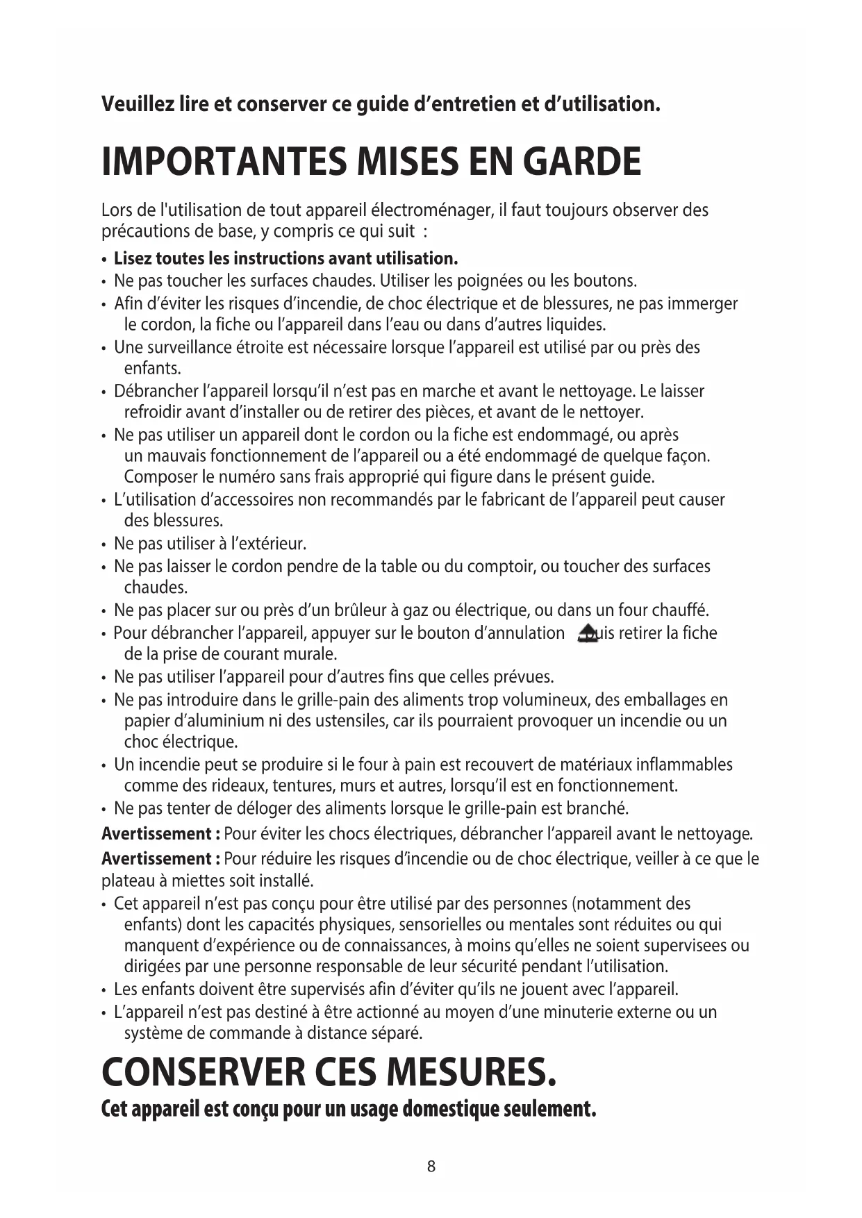 - L’appareil n’est pas destiné à être actionné au moyen d’une minuterie externe ou un système de commande à distance séparé. CONSERVER CES MESURES. Cet appareil est conçu pour un usage domestique seulement.9