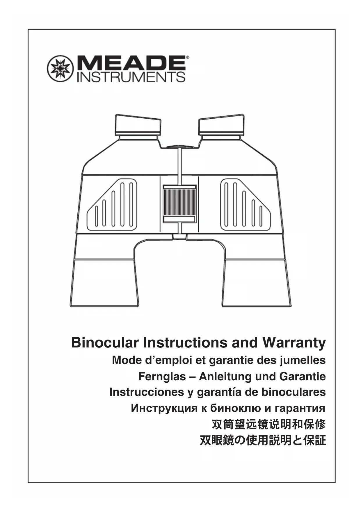 Remove dirt or liquid from under the eyecup flange (next to the lens surface) by removing the eyecup (by gently lifting it up) and carefully cleaning the entire lens surface as described above. When the lenses are fully cleaned, carefully replace the eyecups and avoid touching the surface of the lens with your fingers. Meade Binocular Limited Lifetime Warranty Every Meade binocular is warranted by Meade Instruments Corp (MIC) to be free of defects in materials and workmanship for the lifetime of the original purchaser. MIC will repair or replace the prod- uct, or part thereof, found upon inspection by MIC to be defective, provided the defective part or product is returned to MIC, freight prepaid, with proof of purchase. This warranty applies to the original purchaser only and is non-transferable. MIC products purchased outside North America are not included in this warranty, but are covered under separate warranties issued by Meade International Distributors. RGA Number Required: Prior to the return of any product or part, a Return Goods Authorization (RGA) number must be obtained from Meade by writing, calling 800-626-3233 (7:00am to 5:00pm, Pacific Time Zone) or by sending an email to binocularsupport@ meade.com. Each returned part or product must include a written statement detailing the nature of the claimed defect, as well as the owner’s name, address, and phone number. This warranty is not valid in cases where the product has been abused or mishandled, where unauthorized repairs have been attempted or performed, or where depreciation of the product is due to normal wear-and-tear. Meade specifically disclaims special, indirect, or consequential damages or lost profit, which may result from a breach of this warranty. Any implied warranties which cannot be disclaimed are hereby limited to a term of one year from the date of original retail purchase. This warranty gives you specific rights. You may have other rights which vary from state to state. Meade reserves the right to change product specifications or to discontinue productions without prior notice. This warranty supersedes all previous Meade binocular warranties. ® The name “Meade,” and the Meade logo, are trademarks regis- tered with the U.S. Patent Office and in principal countries through- out the world. All rights reserved. © 2014 Meade Instruments Corporation. Specifications subject to change without notice.4 Instructions pour utiliser et prendre soin au mieux de vos jumelles Meade Vos jumelles Meade sont conçues pour vous offrir des performances optimales pour votre plus grand plaisir d’observation. Quelle que soit la nature de votre observation - ornithologie, sciences naturelles, épreuves sportives ou tourisme - vous apprécierez sans aucun doute les optiques de qualité supérieure ainsi que le soin qui a été apporté à la manufacture de vos jumelles Meade, garantissant un investissement excellent.Pour protéger votre investissement et garantir que vous appréciiez au maximum toutes les fonctionnalités offertes par vos jumelles Meade pendant de nombreuses années, prenez quelques minutes pour lire ce mode d’emploi et ainsi savoir comment utiliser et entretenir au mieux vos jumelles.PRESENTATION DE VOS JUMELLES MEADEPour améliorer votre confort d’observation, consacrez un moment à la familiarisation avec vos jumelles Meade :CONSEIL POUR LES PORTEURS DE LUNETTESPour obtenir le meilleur résultat d’observation si vous portez des lunettes, abaissez les oeuillettons de caoutchouc pour les mettre en contact avec vos lunettes. RÉGLER LES OCULAIRESLa distance entre vos yeux est rarement similaire à celle d’une autre personne. Cette distance est connue sous le terme de Distance Interpupillaire (DIP). Le réglage de votre IPD est une étape cruciale pour l’utilisation correcte de vos jumelles Meade :1. Portez les jumelles à votre visage en position normale d’observation, en tenant chaque barillet fermement.2. Écartez ou rapprochez les barillets jusqu’à ce que vous ne voyiez qu’un champ circulaire unique avec chaque œil.EFFECTUER LA MISE AU POINT DES JUMELLES1. Réglez la compensation de dioptrie (voir schéma) sur zéro.2. Observez un objet situé à environ 30 mètres (100 pieds) de vous.3. Tenez le capuchon de l’objectif devant la lentille de droite, de manière à ce que vous ne voyiez que d’un œil.4. Faites pivoter la molette de mise au point jusqu’à ce que l’image que vous voyez de l’œil gauche soit nette et claire. L’objet observé est mis au point.5. Tenez ensuite le capuchon de l’objectif (ou votre main) devant l’objectif de gauche, de manière à ce que vous ne voyiez que de l’oeil droit.6. Faites pivoter la molette de mise au point jusqu’à ce que l’image que vous voyez de l’œil droit soit nette et claire. L’objet observé est mis au point.7. Dorénavant, vous pourrez effectuer la mise au point sur les objets proches ou éloignés d’un simple pivot de la molette.EFFECTUER LA MISE AU POINT DE JUMELLES À ZOOM Certains modèles de jumelles Meade sont capables d’effectuer un « zoom » - qui permet de se rapprocher ou de s’éloigner d’un objet. Pour effectuer la mise au point de telles jumelles, effectuez l’agrandissement le plus grand possible, puis appliquez les étapes de mise au point décrites ci-dessus. Une fois la mise au point effectuée pour vos yeux à la puissance de grossissement maximum, déplacez simplement le levier de zoom (voir schéma) pour effectuer la mise au point à basse puissance. REMARQUE : les jumelles à zoom permettent en principe une observation de meilleure qualité à basse puissance.MODÈLES RÉSISTANTS À L’EAU / MODÈLES ANTI-BROUILLARDCertains modèles de jumelles Meade sont équipés pour résister à la formation interne de condensation, à l’humidité et à la poussière. Les jumelles résistantes à l’eau et anti-brouillard ont été purgées au nitrogène pour en expulser toute l’humidité et l’