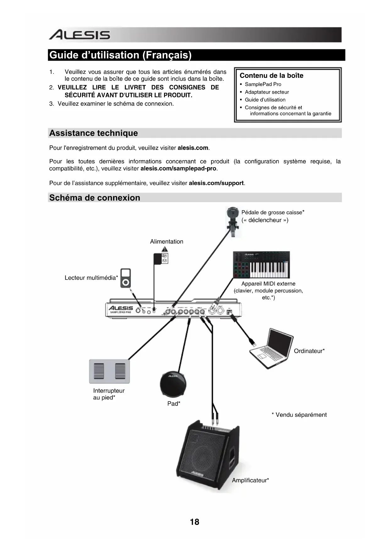 Assistance technique Pour l'enregistrement du produit, veuillez visiter alesis.com. Pour les toutes dernières informations concernant ce produit (la configuration système requise, la compatibilité, etc.), veuillez visiter alesis.com/samplepad-pro. Pour de l’assistance supplémentaire, veuillez visiter alesis.com/support. Schéma de connexion