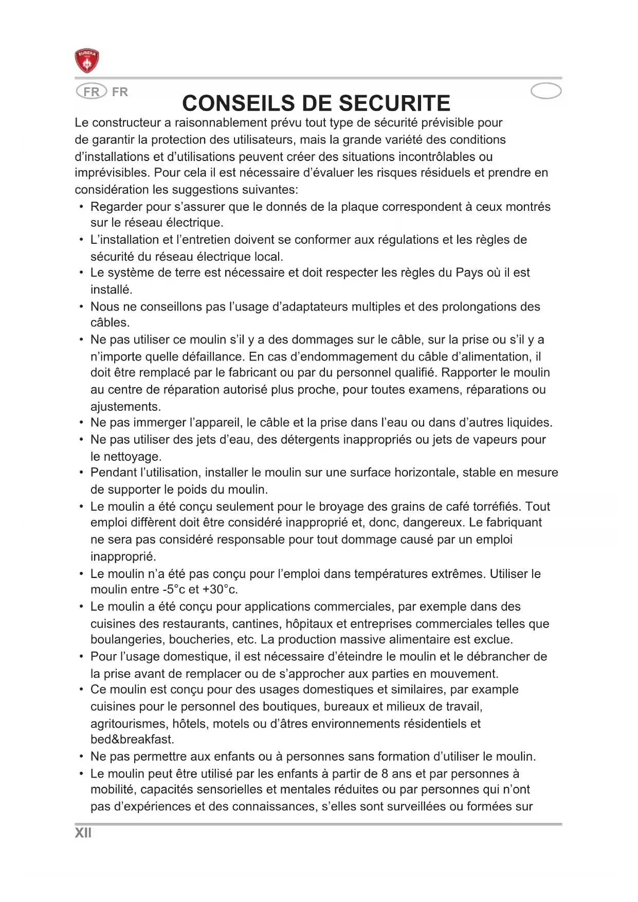- Le moulin a été conçu seulement pour le broyage des grains de café torréfiés. Tout emploi diffèrent doit être considéré inapproprié et, donc, dangereux. Le fabriquant ne sera pas considéré responsable pour tout dommage causé par un emploi inapproprié.