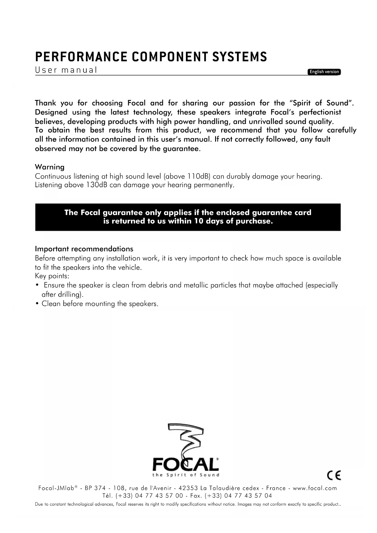 - BP 374 - 108, rue de l'Avenir - 42353 La Talaudière cedex - France - www.focal.com Tél. (+33) 04 77 43 57 00 - Fax. (+33) 04 77 43 57 04Nous vous remercions d’avoir choisi les kits Performance Séparés et de partager avec nous notre philosophie "the Spirit of Sound". Ces haut-parleurs de haute technicité intègrent les ultimes perfectionnements Focal en matière de conception de haut-parleurs pour l’obtention d’un son puissant et de très haute qualité. Afin d’exploiter toutes leurs performances, nous vous conseillons de lire ce livret, puis de le conserver avec précaution pour pouvoir vous y référer ultérieurement. Tout problème dû au non-respect des règles d’utilisation peut entraîner l’invalidation de la garantie. Avertissement L’écoute prolongée à fort niveau au-delà de 110 dB peut détériorer durablement l’audition. Des écoutes même brèves à plus de 130 dB peuvent provoquer des lésions auditives irrémédiables. Pour validation de la garantie Focal, merci de nous retourner la garantie jointe dans les 10 jours. Recommandations importantes Avant tout, vérifiez l’espace disponible pour l’encastrement des haut-parleurs (se reporter aux plans sur l’emballage) puis procédez aux découpes. Dans le cas d’un montage en emplacement d’origine, vérifiez qu’il y ait un espace suffisant entre le haut-parleur et la grille de protection.