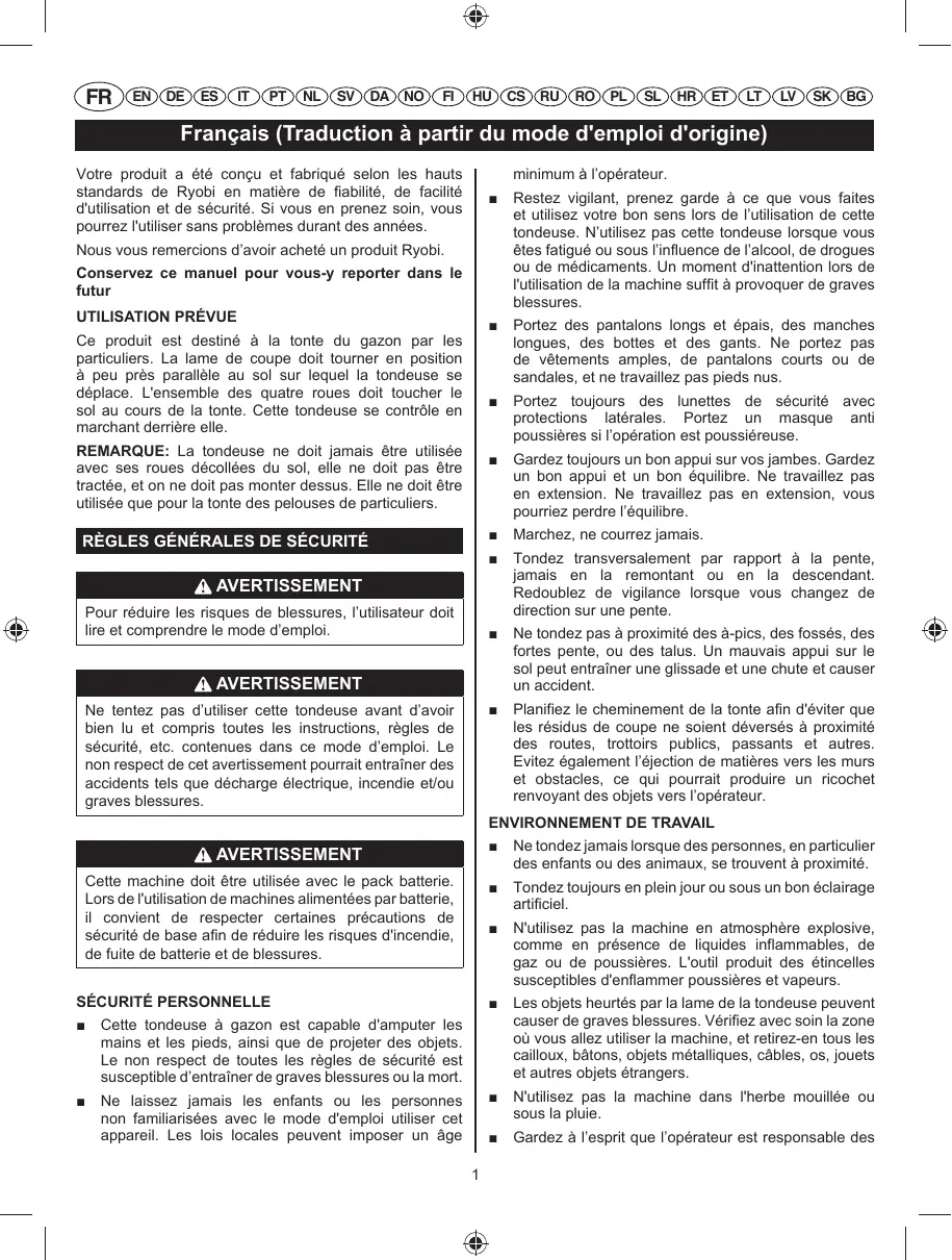 Nous vous remercions d’avoir acheté un produit Ryobi. Conservez ce manuel pour vous-y reporter dans le futur UTILISATION PRÉVUE Ce produit est destiné à la tonte du gazon par les particuliers. La lame de coupe doit tourner en position à peu près parallèle au sol sur lequel la tondeuse se déplace. L'ensemble des quatre roues doit toucher le sol au cours de la tonte. Cette tondeuse se contrôle en marchant derrière elle. REMARQUE: La tondeuse ne doit jamais être utilisée avec ses roues décollées du sol, elle ne doit pas être tractée, et on ne doit pas monter dessus. Elle ne doit être utilisée que pour la tonte des pelouses de particuliers.