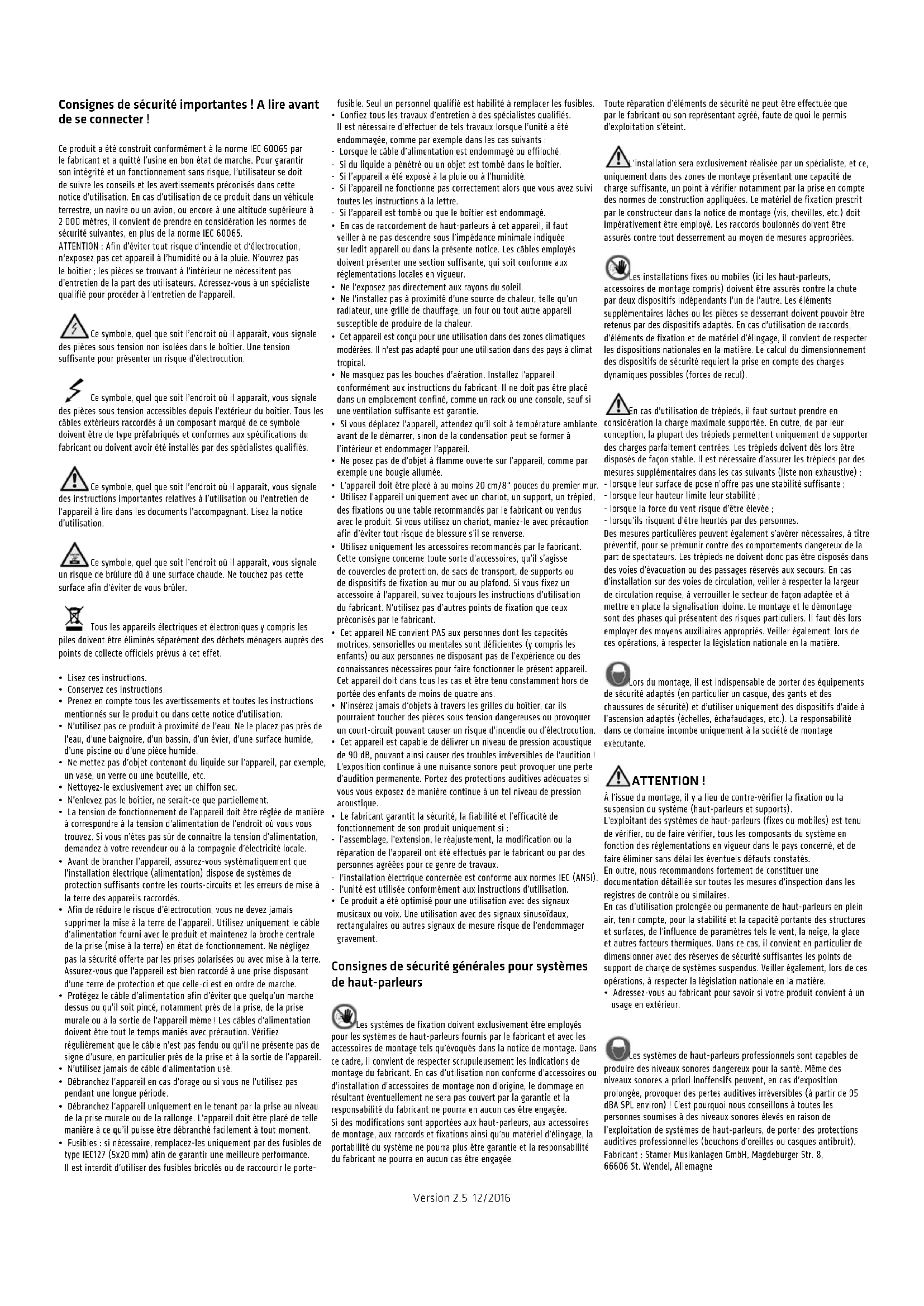 - Ce produit a été optimisé pour une utilisation avec des signaux musicaux ou voix. Une utilisation avec des signaux sinusoïdaux, rectangulaires ou autres signaux de mesure risque de l’endommager gravement. Consignes de sécurité générales pour systèmes de haut-parleurs Les systèmes de fixation doivent exclusivement être employés pour les systèmes de haut-parleurs fournis par le fabricant et avec les accessoires de montage tels qu’évoqués dans la notice de montage. Dans ce cadre, il convient de respecter scrupuleusement les indications de montage du fabricant. En cas d’utilisation non conforme d’accessoires ou d’installation d’accessoires de montage non d’origine, le dommage en résultant éventuellement ne sera pas couvert par la garantie et la responsabilité du fabricant ne pourra en aucun cas être engagée. Si des modifications sont apportées aux haut-parleurs, aux accessoires de montage, aux raccords et fixations ainsi qu’au matériel d’élingage, la portabilité du système ne pourra plus être garantie et la responsabilité du fabricant ne pourra en aucun cas être engagée. Toute réparation d’éléments de sécurité ne peut être effectuée que par le fabricant ou son représentant agréé, faute de quoi le permis d’exploitation s’éteint. L’installation sera exclusivement réalisée par un spécialiste, et ce, uniquement dans des zones de montage présentant une capacité de charge suffisante, un point à vérifier notamment par la prise en compte des normes de construction appliquées. Le matériel de fixation prescrit par le constructeur dans la notice de montage (vis, chevilles, etc.) doit impérativement être employé. Les raccords boulonnés doivent être assurés contre tout desserrement au moyen de mesures appropriées. Les installations fixes ou mobiles (ici les haut-parleurs, accessoires de montage compris) doivent être assurés contre la chute par deux dispositifs indépendants l’un de l’autre. Les éléments supplémentaires lâches ou les pièces se desserrant doivent pouvoir être retenus par des dispositifs adaptés. En cas d’utilisation de raccords, d’éléments de fixation et de matériel d’élingage, il convient de respecter les dispositions nationales en la matière. Le calcul du dimensionnement des dispositifs de sécurité requiert la prise en compte des charges dynamiques possibles (forces de recul). En cas d’utilisation de trépieds, il faut surtout prendre en considération la charge maximale supportée. En outre, de par leur conception, la plupart des trépieds permettent uniquement de supporter des charges parfaitement centrées. Les trépieds doivent dès lors être disposés de façon stable. Il est nécessaire d’assurer les trépieds par des mesures supplémentaires dans les cas suivants (liste non exhaustive) : - lorsque leur surface de pose n’offre pas une stabilité suffisante; - lorsque leur hauteur limite leur stabilité ; - lorsque la force du vent risque d’être élevée ; - lorsqu’ils risquent d’être heurtés par des personnes. Des mesures particulières peuvent également s’avérer nécessaires, à titre préventif, pour se prémunir contre des comportements dangereux de la part de spectateurs. Les trépieds ne doivent donc pas être disposés dans des voies d’évacuation ou des passages réservés aux secours. En cas d’installation sur des voies de circulation, veiller à respecter la largeur de circulation requise, à verrouiller le secteur de façon adaptée et à mettre en place la signalisation idoine. Le montage et le démontage sont des phases qui présentent des risques particuliers. Il faut dès lors employer des moyens auxiliaires appropriés. Veiller également, lors de ces opérations, à respecter la législation nationale en la matière. Lors du montage, il est indispensable de porter des équipements de sécurité adaptés (en particulier un casque, des gants et des chaussures de sécurité) et d’utiliser uniquement des dispositifs d’aide à l’ascension adaptés (échelles, échafaudages, etc.). La responsabilité dans ce domaine incombe uniquement à la société de montage exécutante. ATTENTION! À l’issue du montage, il y a lieu de contre-vérifier la fixation ou la suspension du système (haut-parleurs et supports). L’exploitant des systèmes de haut-parleurs (fixes ou mobiles) est tenu de vérifier, ou de faire vérifier, tous les composants du système en fonction des réglementations en vigueur dans le pays concerné, et de faire éliminer sans délai les éventuels défauts constatés. En outre, nous recommandons fortement de constituer une documentation détaillée sur toutes les mesures d’inspection dans les registres de contrôle ou similaires. En cas d’utilisation prolongée ou permanente de haut-parleurs en plein air, tenir compte, pour la stabilité et la capacité portante des structures et surfaces, de l’influence de paramètres tels le vent, la neige, la glace et autres facteurs thermiques. Dans ce cas, il convient en particulier de dimensionner avec des réserves de sécurité suffisantes les points de support de charge de systèmes suspendus. Veiller également, lors de ces opérations, à respecter la législation nationale en la matière.