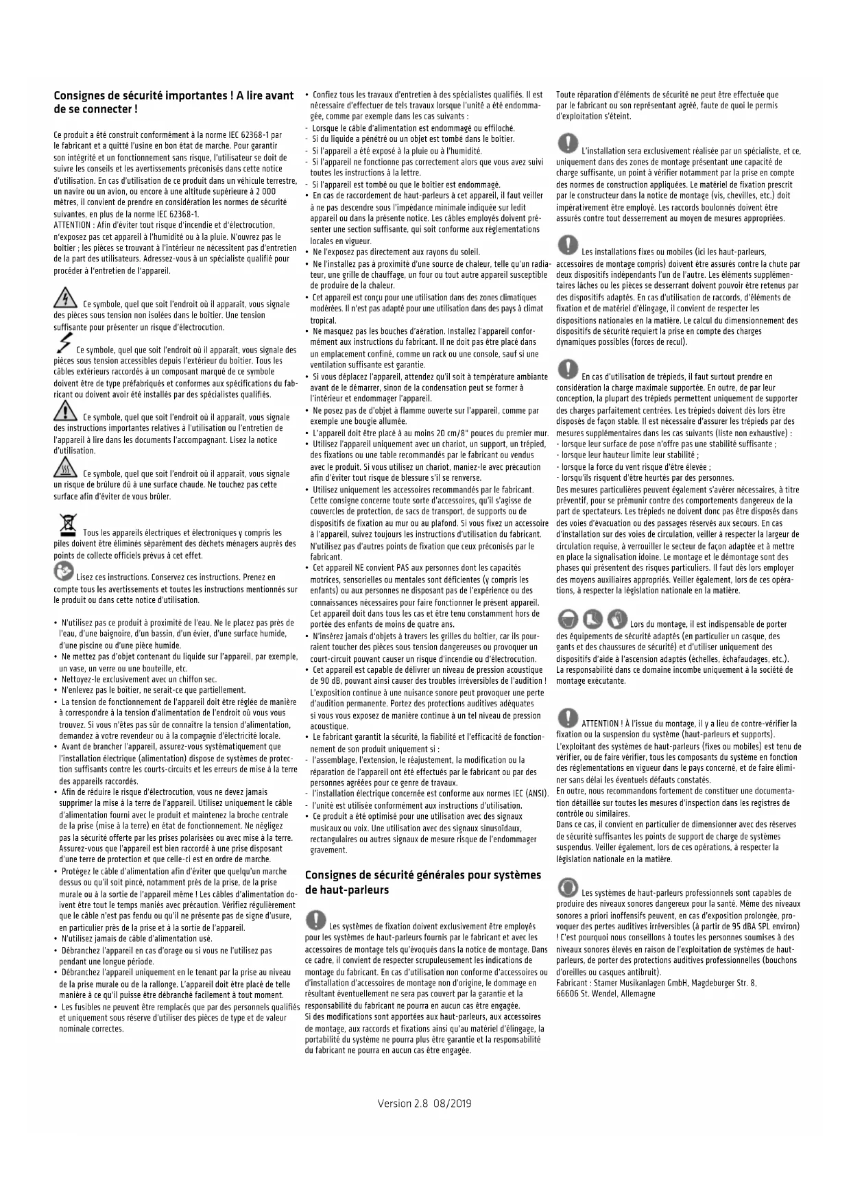 - Ce produit a été optimisé pour une utilisation avec des signaux musicaux ou voix. Une utilisation avec des signaux sinusoïdaux, rectangulaires ou autres signaux de mesure risque de l’endommager gravement. Consignes de sécurité générales pour systèmes de haut-parleurs Les systèmes de fixation doivent exclusivement être employés pour les systèmes de haut-parleurs fournis par le fabricant et avec les accessoires de montage tels qu’évoqués dans la notice de montage. Dans ce cadre, il convient de respecter scrupuleusement les indications de montage du fabricant. En cas d’utilisation non conforme d’accessoires ou d’installation d’accessoires de montage non d’origine, le dommage en résultant éventuellement ne sera pas couvert par la garantie et la responsabilité du fabricant ne pourra en aucun cas être engagée. Si des modifications sont apportées aux haut-parleurs, aux accessoires de montage, aux raccords et fixations ainsi qu’au matériel d’élingage, la portabilité du système ne pourra plus être garantie et la responsabilité du fabricant ne pourra en aucun cas être engagée. Toute réparation d’éléments de sécurité ne peut être effectuée que par le fabricant ou son représentant agréé, faute de quoi le permis d’exploitation s’éteint. L’installation sera exclusivement réalisée par un spécialiste, et ce, uniquement dans des zones de montage présentant une capacité de charge suffisante, un point à vérifier notamment par la prise en compte des normes de construction appliquées. Le matériel de fixation prescrit par le constructeur dans la notice de montage (vis, chevilles, etc.) doit impérativement être employé. Les raccords boulonnés doivent être assurés contre tout desserrement au moyen de mesures appropriées. Les installations fixes ou mobiles (ici les haut-parleurs, accessoires de montage compris) doivent être assurés contre la chute par deux dispositifs indépendants l’un de l’autre. Les éléments supplémen- taires lâches ou les pièces se desserrant doivent pouvoir être retenus par des dispositifs adaptés. En cas d’utilisation de raccords, d’éléments de fixation et de matériel d’élingage, il convient de respecter les dispositions nationales en la matière. Le calcul du dimensionnement des dispositifs de sécurité requiert la prise en compte des charges dynamiques possibles (forces de recul). En cas d’utilisation de trépieds, il faut surtout prendre en considération la charge maximale supportée. En outre, de par leur conception, la plupart des trépieds permettent uniquement de supporter des charges parfaitement centrées. Les trépieds doivent dès lors être disposés de façon stable. Il est nécessaire d’assurer les trépieds par des mesures supplémentaires dans les cas suivants (liste non exhaustive) : - lorsque leur surface de pose n’offre pas une stabilité suffisante; - lorsque leur hauteur limite leur stabilité ; - lorsque la force du vent risque d’être élevée ; - lorsqu’ils risquent d’être heurtés par des personnes. Des mesures particulières peuvent également s’avérer nécessaires, à titre préventif, pour se prémunir contre des comportements dangereux de la part de spectateurs. Les trépieds ne doivent donc pas être disposés dans des voies d’évacuation ou des passages réservés aux secours. En cas d’installation sur des voies de circulation, veiller à respecter la largeur de circulation requise, à verrouiller le secteur de façon adaptée et à mettre en place la signalisation idoine. Le montage et le démontage sont des phases qui présentent des risques particuliers. Il faut dès lors employer des moyens auxiliaires appropriés. Veiller également, lors de ces opéra- tions, à respecter la législation nationale en la matière. Lors du montage, il est indispensable de porter des équipements de sécurité adaptés (en particulier un casque, des gants et des chaussures de sécurité) et d’utiliser uniquement des dispositifs d’aide à l’ascension adaptés (échelles, échafaudages, etc.). La responsabilité dans ce domaine incombe uniquement à la société de montage exécutante. ATTENTION! À l’issue du montage, il y a lieu de contre-vérifier la fixation ou la suspension du système (haut-parleurs et supports). L’exploitant des systèmes de haut-parleurs (fixes ou mobiles) est tenu de vérifier, ou de faire vérifier, tous les composants du système en fonction des réglementations en vigueur dans le pays concerné, et de faire élimi- ner sans délai les éventuels défauts constatés. En outre, nous recommandons fortement de constituer une documenta- tion détaillée sur toutes les mesures d’inspection dans les registres de contrôle ou similaires. Dans ce cas, il convient en particulier de dimensionner avec des réserves de sécurité suffisantes les points de support de charge de systèmes suspendus. Veiller également, lors de ces opérations, à respecter la législation nationale en la matière. Les systèmes de haut-parleurs professionnels sont capables de produire des niveaux sonores dangereux pour la santé. Même des niveaux sonores a priori inoffensifs peuvent, en cas d’exposition prolongée, pro- voquer des pertes auditives irréversibles (à partir de 95 dBA SPL environ) ! C’est pourquoi nous conseillons à toutes les personnes soumises à des niveaux sonores élevés en raison de l’exploitation de systèmes de haut- parleurs, de porter des protections auditives professionnelles (bouchons d’oreilles ou casques antibruit). Fabricant : Stamer Musikanlagen GmbH, Magdeburger Str. 8, 66606 St. Wendel, AllemagnePOLAR 10 1.1
