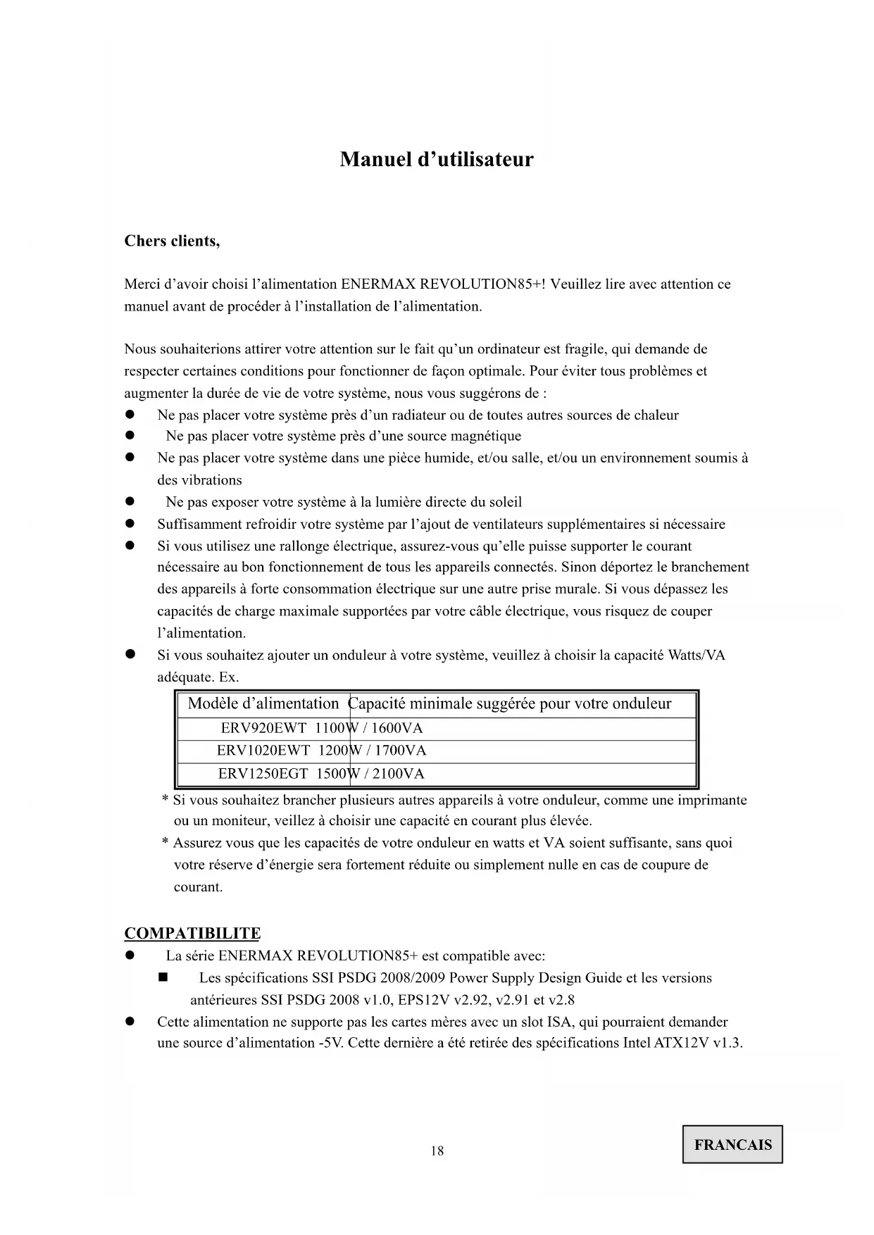 Chers clients, Merci d’avoir choisi l’alimentation ENERMAX REVOLUTION85+! Veuillez lire avec attention ce manuel avant de procéder à l’installation de l’alimentation. Nous souhaiterions attirer votre attention sur le fait qu’un ordinateur est fragile, qui demande de respecter certaines conditions pour fonctionner de façon optimale. Pour éviter tous problèmes et augmenter la durée de vie de votre système, nous vous suggérons de : Ne pas placer votre système près d’un radiateur ou de toutes autres sources de chaleur Ne pas placer votre système près d’une source magnétique Ne pas placer votre système dans une pièce humide, et/ou salle, et/ou un environnement soumis à des vibrations Ne pas exposer votre système à la lumière directe du soleil Suffisamment refroidir votre système par l’ajout de ventilateurs supplémentaires si nécessaire Si vous utilisez une rallonge électrique, assurez-vous qu’elle puisse supporter le courant nécessaire au bon fonctionnement de tous les appareils connectés. Sinon déportez le branchement des appareils à forte consommation électrique sur une autre prise murale. Si vous dépassez les capacités de charge maximale supportées par votre câble électrique, vous risquez de couper l’alimentation. Si vous souhaitez ajouter un onduleur à votre système, veuillez à choisir la capacité Watts/VA adéquate. Ex. Modèle d’alimentation Capacité minimale suggérée pour votre onduleur