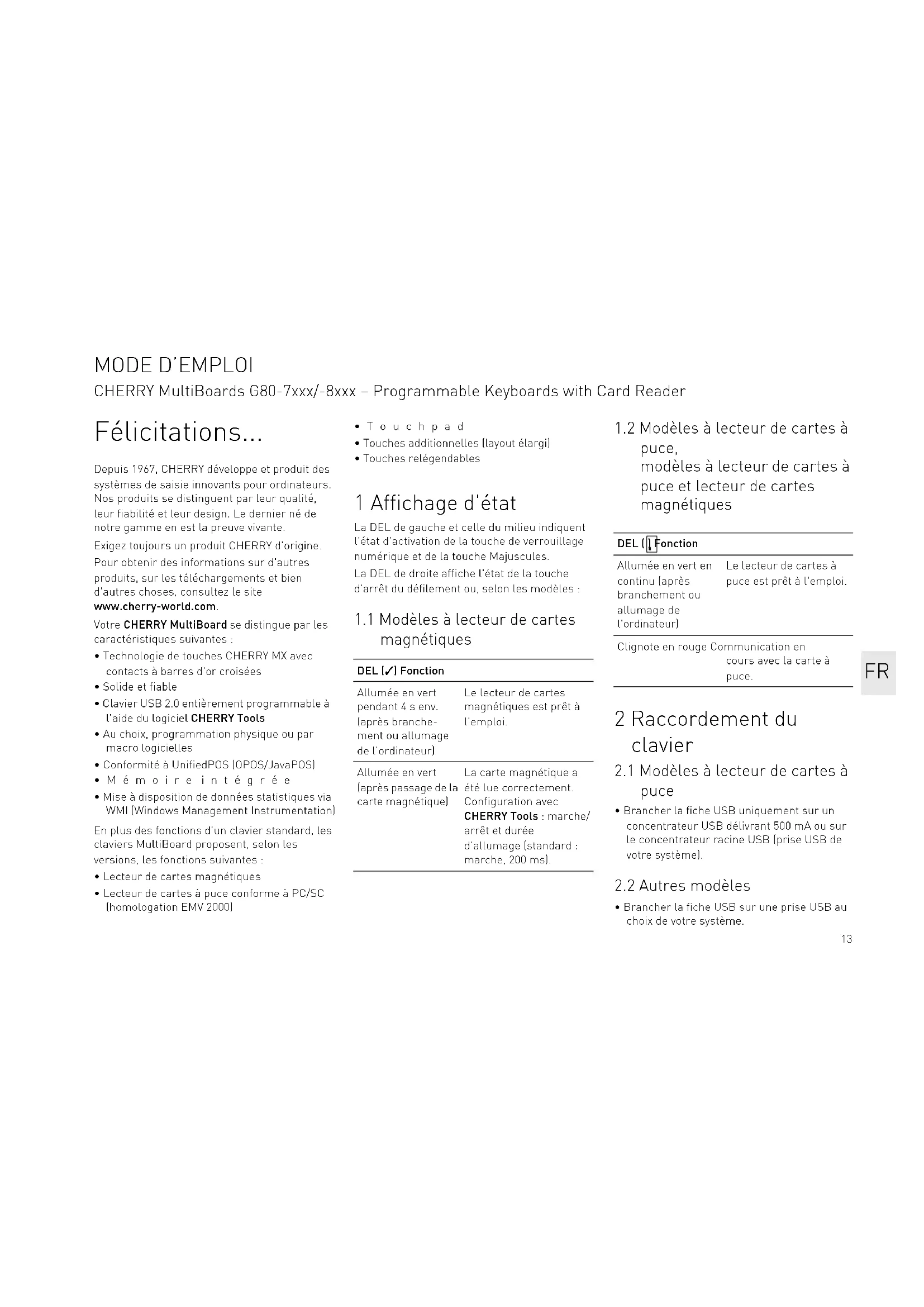 For use with Listed Personal Computers only! OPERATING MANUAL CHERRY MultiBoards G80-7xxx/-8xxx – Programmable Keyboards with Card Reader GB13 Félicitations... Depuis 1967, CHERRY développe et produit des systèmes de saisie innovants pour ordinateurs. Nos produits se distinguent par leur qualité, leur fiabilité et leur design. Le dernier né de notre gamme en est la preuve vivante. Exigez toujours un produit CHERRY d'origine. Pour obtenir des informations sur d'autres produits, sur les téléchargements et bien d'autres choses, consultez le site www.cherry-world.com. Votre CHERRY MultiBoard se distingue par les caractéristiques suivantes :