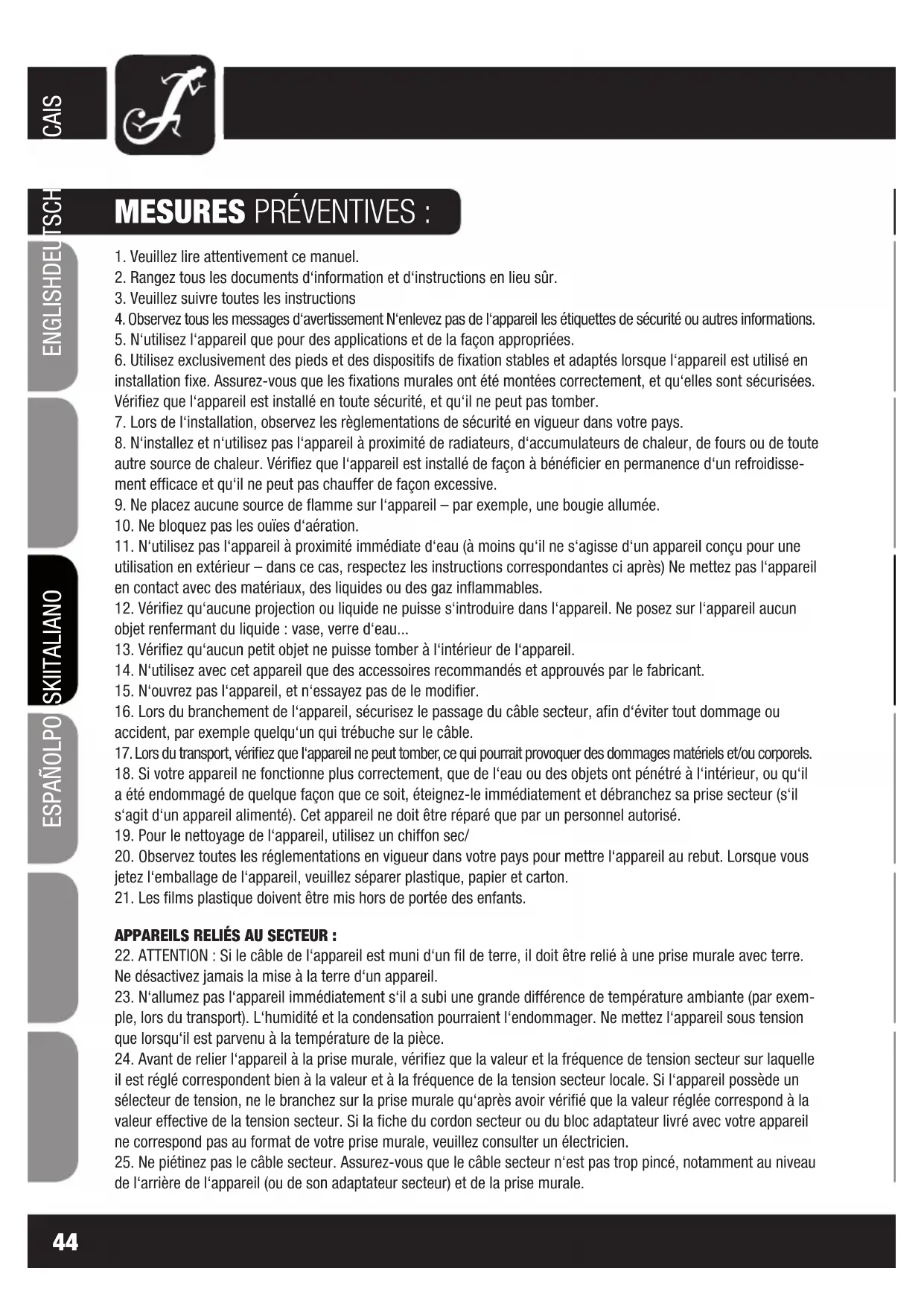 16. Lors du branchement de l‘appareil, sécurisez le passage du câble secteur, afin d‘éviter tout dommage ou