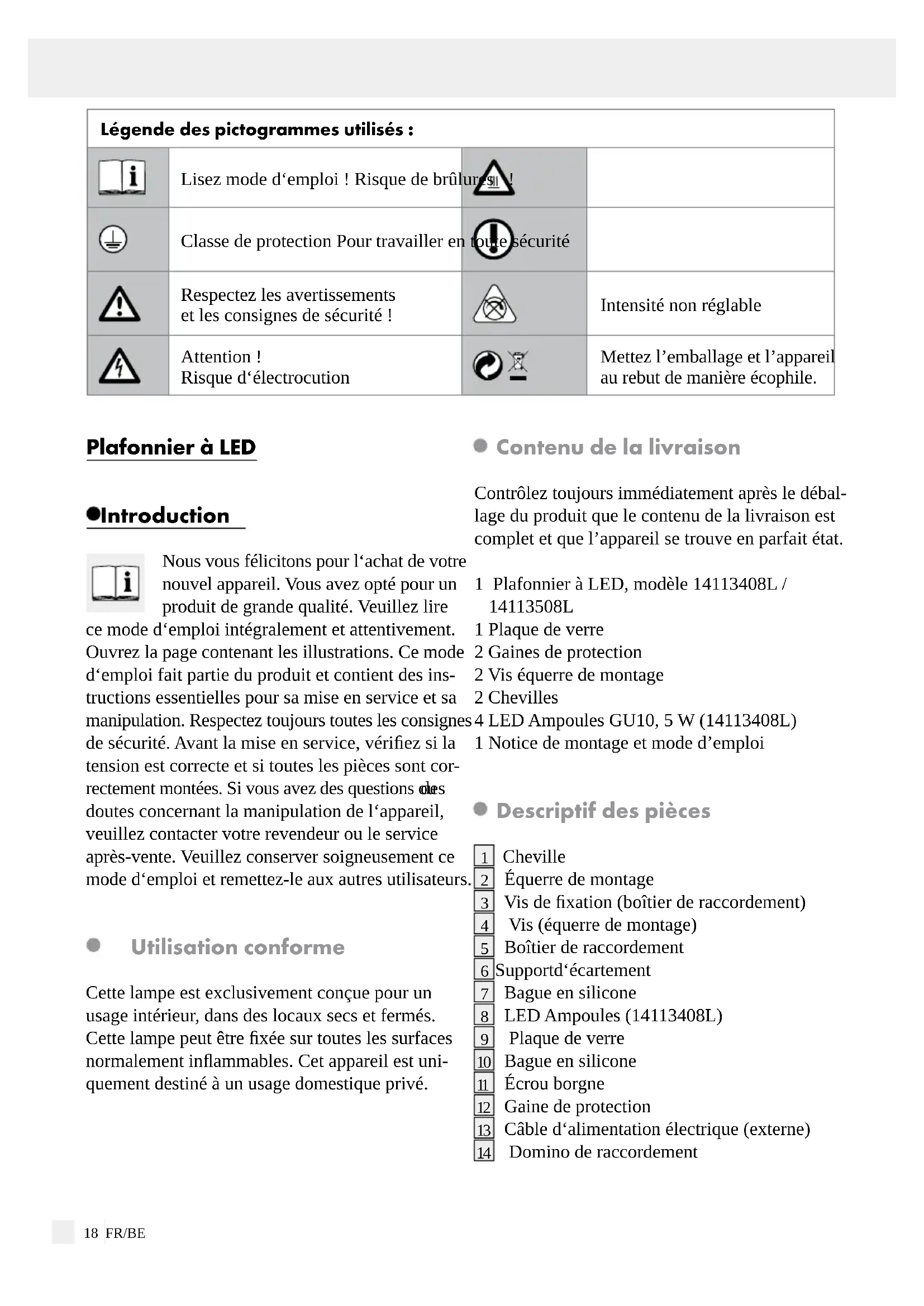 , 50 Hz (14113508L) Puissance nominale: 4 x 5 W (14113408L) 1 x 10,5 W (14113508L) Éclairage : 4 x LED GU10, 5 W (14113408L) 1 x module LED, 10,5 W (LED non échangeable 14113508L) Facteur de puissance/ Courant nominalpar module LED : 0,54 / 80 mA (14113508L) Classe de protection : I / Indice de protection : IP20 Sécurité Indications de sécurité Les droits de recours en garantie sont annulés en cas de dommages résultant du non-respect du présent mode d’emploi ! Le fabricant décline toute respon- sabilité pour les dommages consécutifs ! Toute responsabilité est déclinée pour les dommages ma- tériels ou corporels causés par une manipulation incorrecte ou par le non-respect des consignes de sécurité ! Ne laissez pas la lampe ou le matériel d‘embal- lage traîner sans surveillance. Les films / sachets en plastique, les éléments en matières synthéti ques, etc. peuvent devenir des jouets dangereux dans les mains des enfants. Attention ! Risque d‘électrocution L‘installation électrique doit être effectuée par un électricien ou par une personne dûment formée à cet effet. Avant chaque raccordement au secteur, contrô- lez le bon état de la lampe et du câble d‘alimen- tation. N‘utilisez jamais la lampe si vous constatez le moindre dommage. ATTENTION ! Des câbles secteur endommagés impliquent un danger de mort par électrocution. En cas d’endommagements, de réparations ou d’autres problèmes, veuillez contacter le SAV ou un électricien. Avant le montage, retirez le fusible ou coupez le disjoncteur de la boîte à fusibles (position 0). Avant le montage, vérifiez que la tension secteur corresponde à la tension de service requise de la lampe (230 - 240 V