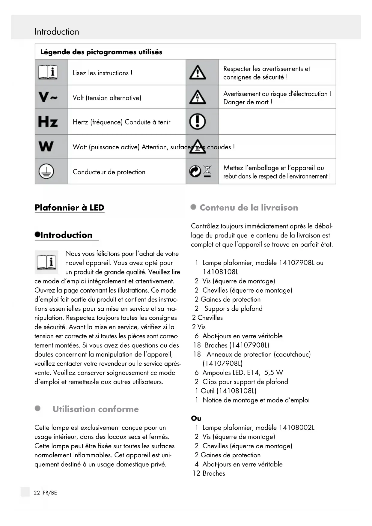 Légende des pictogrammes utilisés .......................................................................... Page 22 Introduction ................................................................................................................................... Page 22 Utilisation conforme ............................................................................................................................Page 22 Contenu de la livraison .......................................................................................................................Page 22 Descriptif des pièces ...........................................................................................................................Page 23 Caractéristiques techniques ................................................................................................................Page 23 Sécurité .............................................................................................................................................Page 23 Indications de sécurité ........................................................................................................................Page 23 Préparation ...................................................................................................................................Page 24 Outils et matériel nécessaires ............................................................................................................. Page 24 Avant l‘installation ..................................................................................................................Page 24 Mise en marche .......................................................................................................................... Page 25 Montage de la lampe .........................................................................................................................Page 25 Orienter le spot ...................................................................................................................................Page 26 Remplacement de l‘ampoule ..............................................................................................................Page 26 Entretien et nettoyage..........................................................................................................Page 26 Mise au rebut ............................................................................................................................... Page 26 Garantie et service après-vente ..................................................................................Page 27 Déclaration de garantie .....................................................................................................................Page 27 Adresse du service après-vente .......................................................................................................... Page 27 Déclaration de conformité .................................................................................................................. Page 27 Fabricant ..............................................................................................................................................Page 27 Table des matières22 FR/BE Introduction Plafonnier à LED Introduction Nous vous félicitons pour l‘achat de votre nouvel appareil. Vous avez opté pour un produit de grande qualité. Veuillez lire ce mode d‘emploi intégralement et attentivement. Ouvrez la page contenant les illustrations. Ce mode d‘emploi fait partie du produit et contient des instruc- tions essentielles pour sa mise en service et sa ma- nipulation. Respectez toujours toutes les consignes de sécurité. Avant la mise en service, vérifiez si la tension est correcte et si toutes les pièces sont correc- tement montées. Si vous avez des questions ou des doutes concernant la manipulation de l‘appareil, veuillez contacter votre revendeur ou le service après- vente. Veuillez conserver soigneusement ce mode d‘emploi et remettez-le aux autres utilisateurs. Utilisation conforme Cette lampe est exclusivement conçue pour un usage intérieur, dans des locaux secs et fermés. Cette lampe peut être fixée sur toutes les surfaces normalement inflammables. Cet appareil est uni- quement destiné à un usage domestique privé. Contenu de la livraison Contrôlez toujours immédiatement après le débal- lage du produit que le contenu de la livraison est complet et que l’appareil se trouve en parfait état. 1 Lampe plafonnier, modèle 14107908L ou 14108108L 2 Vis (équerre de montage) 2 Chevilles (équerre de montage) 2 Gaines de protection 2 Supports de plafond 2 Chevilles 2 Vis 6 Abat-jours en verre véritable 18 Broches (14107908L) 18 Anneaux de protection (caoutchouc) (14107908L) 6 Ampoules LED, E14, 5,5 W 2 Clips pour support de plafond 1 Outil (14108108L) 1 Notice de montage et mode d’emploi
