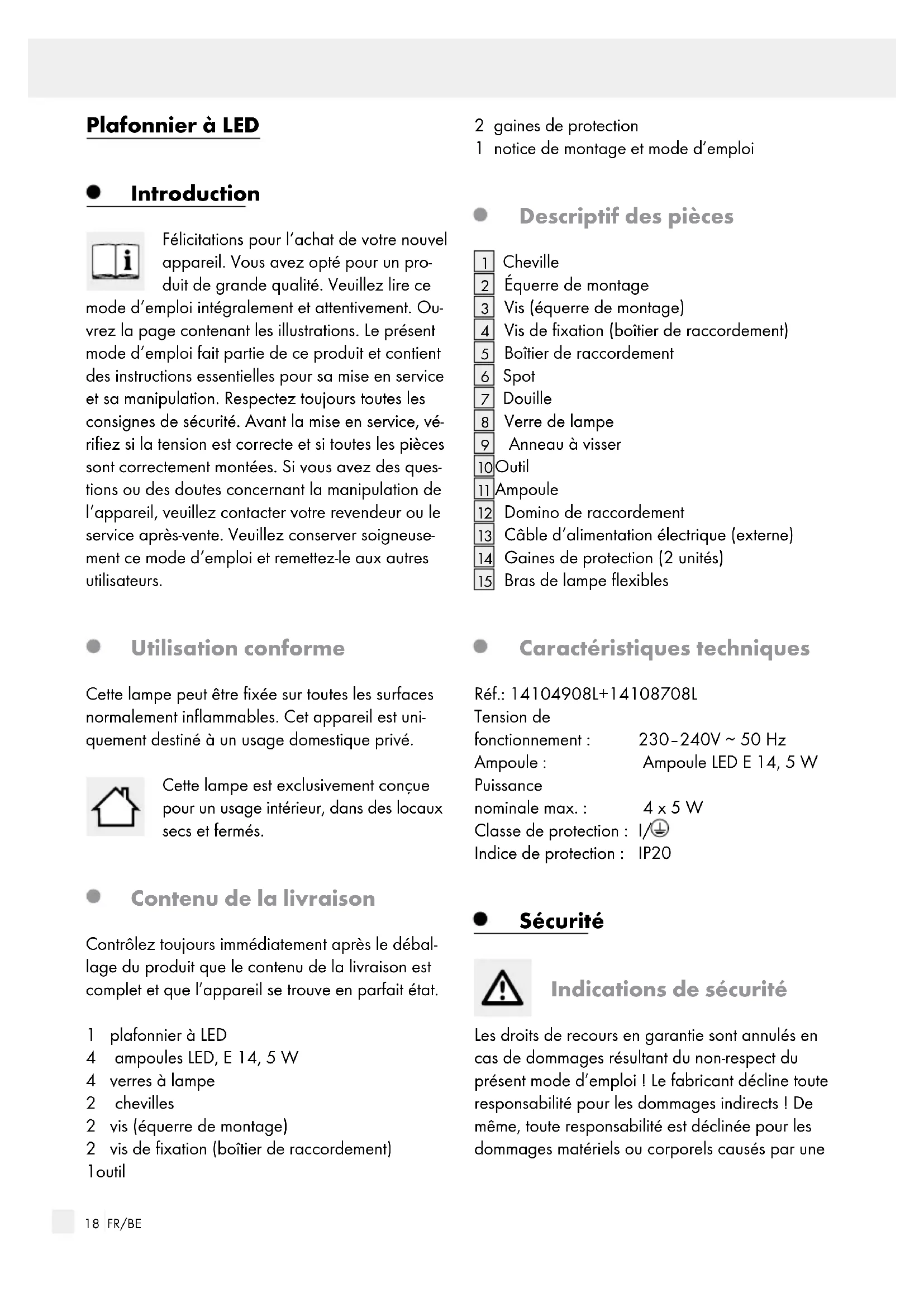 Bras de lampe flexibles Caractéristiques techniques Réf. : 14104908L + 14108708L Tension de fonctionnement : 230–240V ∼ 50 Hz Ampoule : Ampoule LED E 14, 5 W Puissance nominale max. : 4 x 5 W Classe de protection : I/ Indice de protection: IP20 Sécurité Indications de sécurité Les droits de recours en garantie sont annulés en cas de dommages résultant du non-respect du présent mode d’emploi ! Le fabricant décline toute responsabilité pour les dommages indirects ! De même, toute responsabilité est déclinée pour les dommages matériels ou corporels causés par une19 FR/BE Sécurité Introduction / Sécurité manipulation incorrecte ou par le non-respect des consignes de sécurité ! Prévention de risques mortels par électrocution L‘installation électrique doit être effectuée par un électricien ou par une personne dûment formée à cet effet. Avant chaque raccordement au secteur, contrôlez le bon état de la lampe et du câble d‘alimentation. N‘utilisez jamais la lampe si vous constatez le moindre dommage. ATTENTION ! Des câbles secteur endomma- gés impliquent un danger de mort par électro- cution. En cas d’endommagements, de réparations ou d’autres problèmes, veuillez contacter le SAV ou un électricien. Avant le montage, retirez le fusible ou coupez le disjoncteur de la boîte à fusibles (position 0). Avant le montage, vérifiez que la tension secteur corresponde à la tension de service requise de la lampe (230–240 V∼). Évitez impérativement tout contact de la lampe avec de l‘eau ou d‘autres liquides. N‘ouvrez jamais les composants électriques, et n‘insérez jamais des objets quelconques dans ceux-ci. De telles interventions impliquent un danger de mort par électrocution. N‘installez jamais la lampe sur un support humide ou conducteur de courant! Prévention de risque d‘incendies et de blessures RISQUE DE BLESSURES! Immédiatement après le déballage, vérifiez le parfait état de chaque ampoule et verre de lampe. Ne montez pas la lampe avec des ampoules et/ou des verres de lampe défectueux(-ses). Dans ce cas, veuillez contacter le service après-vente pour faire remplacer une pièce défectueuse. RISQUE DE BRÛLURES! Afin d‘éviter toute brûlure, vérifiez que la lampe soit éteinte et suffisamment froide avant de la manipuler. L‘ampoule dé- gage une forte chaleur au niveau du logement de la lampe. Laissez refroidir la lampe complètement. Remplacez immédiatement toute ampoule dé- fectueuse par une neuve. Avant de remplacer l‘ampoule, retirez toujours pour commencer le fusible ou coupez le disjoncteur de la boîte à fusible. 0,5 m RISQUE D‘INCENDIE! La lampe doit être montée à une distance d’au moins 0,5m des objets illumi- nés. Un dégagement de chaleur excessif peut provoquer un incendie. Ne laissez pas la lampe ou le matériel d‘em- ballage traîner sans surveillance. Les films/ sachets en plastique, les éléments en matières synthétiques, etc. peuvent devenir des jouets dangereux dans les mains des enfants. ATTENTION ! Lorsque les LED sont allumées, évitez de les regarder d‘une trop courte distance. Ne pas regarder les LED à l‘aide d‘un instrument optique (par exemple une loupe). Cette lampe n‘est pas compatible avec les variateurs ou les interrup- teurs électroniques. Pour travailler en toute sécurité Utilisez uniquement des ampoules à LED 230– 240 V∼ avec un culot E14 et une puissance maximale de 5 watts. Montez la lampe de telle sorte qu‘elle soit protégée de l‘humidité et des salissures. Soigneusement préparer le montage et l‘effec- tuer sans précipitation. Préparez toutes les pièces détachées et l‘outillage ou le matériel requis et posez-les à portée de main. Soyez toujours vigilant ! Faites toujours atten- tion à ce que vous faites et agissez raisonna- blement. N‘effectuez jamais le montage de la lampe si vous n‘êtes pas concentré ou si vous vous sentez mal.20 FR/BE ... / Entretien et nettoyage / Mise au rebut / Garantie et service après-vente Préparation / Avant l‘installation / Mise en marche Préparation Outils et matériel nécessaires Les outils et matériels indiqués ne sont pas inclus dans le contenu de la livraison. Il s‘agit là de données et de valeurs indicatives vous permettant de vous orienter. Les caractéristiques du matériel dépendent des conditions spécifiques sur place. - Crayon / outil marqueur - Détecteur de tension - Tournevis - Perceuse - Foret (ø env. 0,6 cm) - Pince coupante diagonale - Escabeau Avant l‘installation Important : l‘installation électrique doit être effectuée par un électricien ou par une personne dûment formée à cet effet. Celle-ci doit connaître les caractéristiques des lampes et des conditions de raccordement. Avant l‘installation, familiarisez-vous avec l‘en- semble des instructions et des illustrations du présent mode d‘emploi et avec la lampe elle-même. Avant l‘installation, vérifiez l‘absence de ten- sion au niveau du câble auquel doit être rac- cordé la lampe. Pour ce faire, retirez le fusible ou coupez le disjoncteur de la boîte à fusible (position 0). Vérifiez l‘absence de tension à l‘aide d‘un détecteur de tension. Mise en marche Montage de la lampe Avant le montage, retirez le fusible ou coupez le disjoncteur de la boîte à fusibles (position 0). Ôtez les vis de fixation