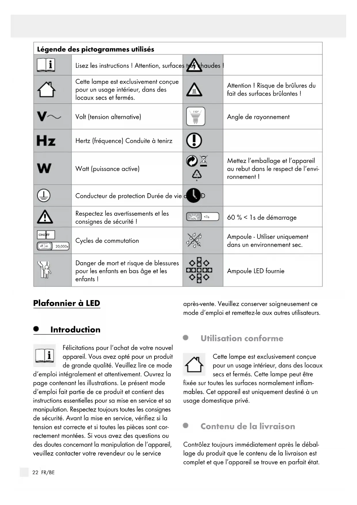 Mettez l’emballage et l’appareil au rebut dans le respect de l‘envi- ronnement ! Conducteur de protection Durée de vie des LED Respectez les avertissements et les consignes de sécurité ! <1s 60% 60 % < 1s de démarrage ON OFF 20,000x Cycles de commutation Ampoule - Utiliser uniquement dans un environnement sec. Danger de mort et risque de blessures pour les enfants en bas âge et les enfants ! Ampoule LED fournie Plafonnier à LED Introduction Félicitations pour l‘achat de votre nouvel appareil. Vous avez opté pour un produit de grande qualité. Veuillez lire ce mode d‘emploi intégralement et attentivement. Ouvrez la page contenant les illustrations. Le présent mode d‘emploi fait partie de ce produit et contient des instructions essentielles pour sa mise en service et sa manipulation. Respectez toujours toutes les consignes de sécurité. Avant la mise en service, vérifiez si la tension est correcte et si toutes les pièces sont cor- rectement montées. Si vous avez des questions ou des doutes concernant la manipulation de l‘appareil, veuillez contacter votre revendeur ou le service après-vente. Veuillez conserver soigneusement ce mode d‘emploi et remettez-le aux autres utilisateurs. Utilisation conforme Cette lampe est exclusivement conçue pour un usage intérieur, dans des locaux secs et fermés. Cette lampe peut être fixée sur toutes les surfaces normalement inflam- mables. Cet appareil est uniquement destiné à un usage domestique privé. Contenu de la livraison Contrôlez toujours immédiatement après le débal- lage du produit que le contenu de la livraison est complet et que l’appareil se trouve en parfait état.23 FR/BE Introduction / SécuritéIntroduction 1 plafonnier à LED, modèle 14134909L / 14135002L / 14135102L 1 verre (14134909L) 3 anneaux de lampe (14135002L / 14135102L) 2 chevilles 2 vis (équerre de montage) 2 gaines de protection 1 notice de montage et mode d‘emploi Descriptif des pièces