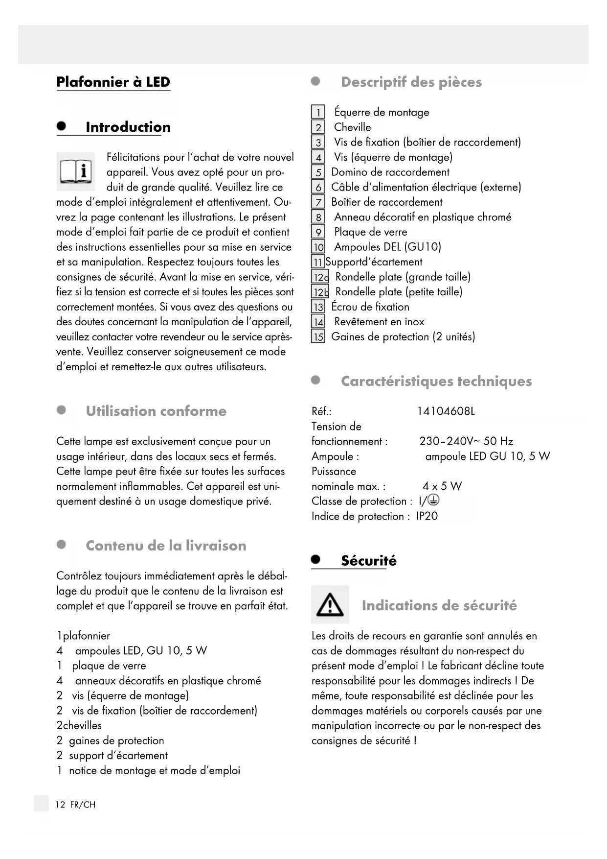 Gaines de protection (2 unités) Caractéristiques techniques Réf. : 14104608L Tension de fonctionnement : 230–240V∼ 50 Hz Ampoule : ampoule LED GU 10, 5 W Puissance nominale max. : 4 x 5 W Classe de protection : I/ Indice de protection: IP20 Sécurité Indications de sécurité Les droits de recours en garantie sont annulés en cas de dommages résultant du non-respect du présent mode d’emploi ! Le fabricant décline toute responsabilité pour les dommages indirects ! De même, toute responsabilité est déclinée pour les dommages matériels ou corporels causés par une manipulation incorrecte ou par le non-respect des consignes de sécurité !13 FR/CH Sécurité / Préparation Introduction / Sécurité Prévention de risques mortels par électrocution L‘installation électrique doit être effectuée par un électricien ou par une personne dûment formée à cet effet. Avant chaque raccordement au secteur, contrôlez le bon état de la lampe et du câble d‘alimentation. N‘utilisez jamais la lampe si vous constatez le moindre dommage. ATTENTION ! Des câbles secteur endomma- gés impliquent un danger de mort par électro- cution. En cas d’endommagements, de réparations ou d’autres problèmes, veuillez contacter le SAV ou un électricien. Avant le montage, retirez le fusible ou coupez le disjoncteur de la boîte à fusibles (position 0). Avant le montage, vérifiez que la tension secteur corresponde à la tension de service requise de la lampe (230–240 V∼). Évitez impérativement tout contact de la lampe avec de l‘eau ou d‘autres liquides. N‘ouvrez jamais les composants électriques, et n‘insérez jamais des objets quelconques dans ceux-ci. De telles interventions impliquent un danger de mort par électrocution. N‘installez jamais la lampe sur un support humide ou conducteur de courant! Prévention de risque d‘incendies et de blessures RISQUE DE BLESSURES! Immédiatement après le déballage, vérifiez le parfait état de chaque ampoule et verre de lampe. Ne montez pas la lampe avec des ampoules et/ou des verres de lampe défectueux(-ses). Dans ce cas, veuillez contacter le service après-vente pour faire remplacer une pièce défectueuse. RISQUE DE BRÛLURES! Afin d‘éviter toute brûlure, vérifiez que la lampe soit éteinte et suffisamment froide avant de la manipuler. L‘ampoule dé- gage une forte chaleur au niveau du logement de la lampe. Laissez refroidir la lampe complètement. Remplacez immédiatement toute ampoule dé- fectueuse par une neuve. Avant de remplacer l‘ampoule, retirez toujours pour commencer le fusible ou coupez le disjoncteur de la boîte à fusible. 0,5 m RISQUE D‘INCENDIE! La lampe doit être montée à une distance d’au moins 0,5m des objets illumi- nés. Un dégagement de chaleur excessif peut provoquer un incendie. Ne laissez pas la lampe ou le matériel d‘em- ballage traîner sans surveillance. Les films/ sachets en plastique, les éléments en matières synthétiques, etc. peuvent devenir des jouets dangereux dans les mains des enfants. ATTENTION ! Lorsque les LED sont allumées, évitez de les regarder d‘une trop courte distance. Ne pas regarder les LED à l‘aide d‘un instrument optique (par exemple une loupe). Pour travailler en toute sécurité Utilisez uniquement des ampoules à LED 230– 240 V∼ GU 10 avec une puissance maximales de 5 watts. Montez la lampe de telle sorte qu‘elle soit protégée de l‘humidité et des salissures. Soigneusement préparer le montage et l‘effec- tuer sans précipitation. Préparez toutes les pièces détachées et l‘outillage ou le matériel requis et posez-les à portée de main. Soyez toujours vigilant ! Faites toujours atten- tion à ce que vous faites et agissez raisonna- blement. N‘effectuez jamais le montage de la lampe si vous n‘êtes pas concentré ou si vous vous sentez mal. Préparation Outils et matériel nécessaires Les outils et matériels indiqués ne sont pas inclus dans le contenu de la livraison. Il s‘agit là de14 FR/CH ... / Entretien et nettoyage / Mise au rebut / Garantie et service après-vente Préparation / Avant l‘installation / Mise en marche données et de valeurs indicatives vous permettant de vous orienter. Les caractéristiques du matériel dépendent des conditions spécifiques sur place. - Crayon / outil marqueur - Détecteur de tension - Tournevis - Perceuse - Foret (ø env. 0,6 cm) - Pince coupante diagonale - Escabeau Avant l‘installation Important : l‘installation électrique doit être effectuée par un électricien ou par une personne dûment formée à cet effet. Celle-ci doit connaître les caractéristiques des lampes et des conditions de raccordement. Avant l‘installation, familiarisez-vous avec l‘en- semble des instructions et des illustrations du présent mode d‘emploi et avec la lampe elle-même. Avant l‘installation, vérifiez l‘absence de ten- sion au niveau du câble auquel doit être rac- cordé la lampe. Pour ce faire, retirez le fusible ou coupez le disjoncteur de la boîte à fusible (position 0). Vérifiez l‘absence de tension à l‘aide d‘un détecteur de tension. Mise en marche Montage de la lampe Montez les anneaux décoratifs en plastique
