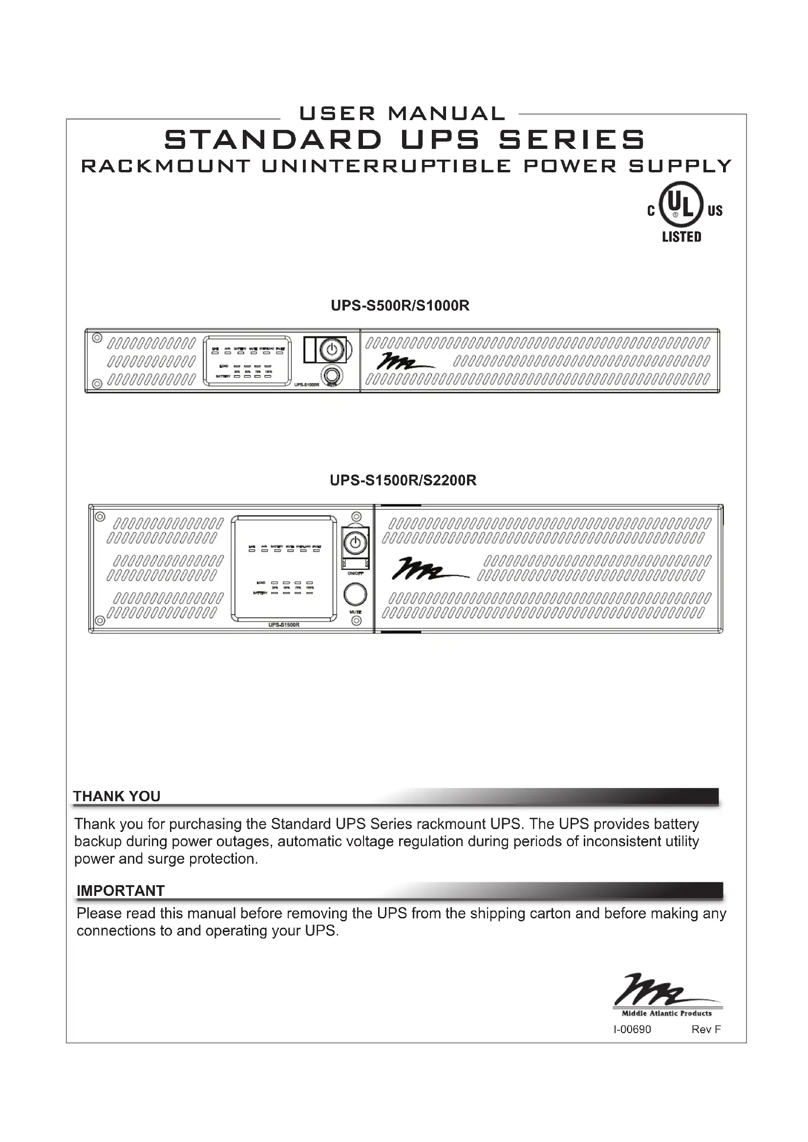 spécifique est nécessaire pour assurer la conformité de l’appareil, cela doit être précisé dans les instructions. ATTENTION: Un cordon d’alimentation blindé est nécessaire pour respecter les limites d’émission fixées par la FCC et pour empêcher les interférences avec les récepteurs radio ou télévision placés à proximité. Il est impératif de n’utiliser que le cordon d’alimentation fourni. Ne connectez de périphériques d’entrée/sortie à cet appareil qu’avec des câbles blindés. ATTENTION: Toute modification apportée à ce produit qui n’est pas expressément approuvée par la garantie peut priver l’utilisateur de son droit d’utiliser l’appareil. FCC WARNING(1) UPS unit; (1) User’s Manual; (2) Rack ears; (8) 10-32 Rack ear screws, for 1U models, (12) for 2U models; (2) Rackmount handles; (installation of handles is optional); (5) 8-32 Rackmount handle screws (installation of handles is optional); (1) Middle Atlantic Power Manager Software CD, (1) USB Cable, (1) EPO Cable