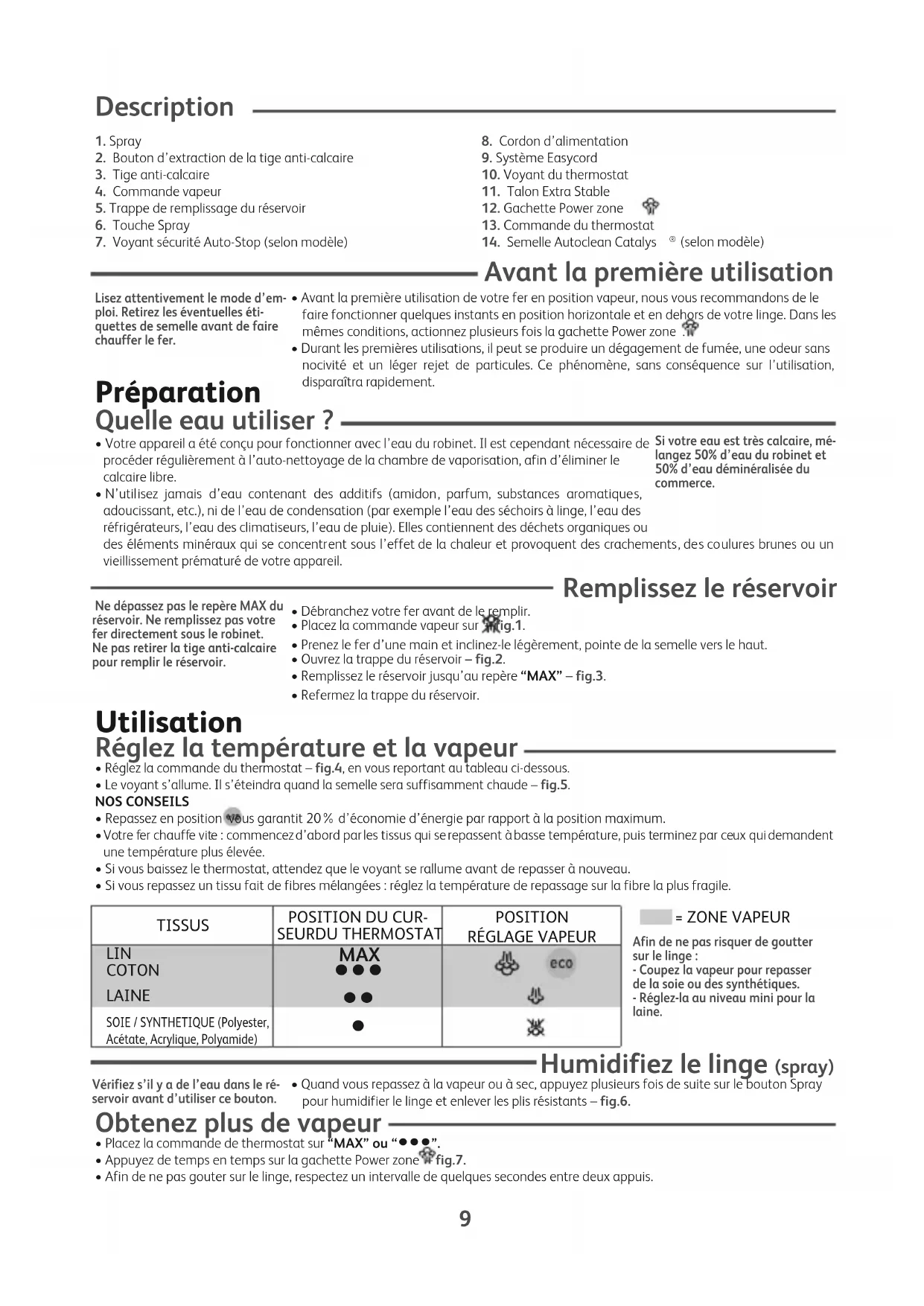 - Réglez la température selon le textile repassé.• Placez la commande vapeur sur – fig.1.• Vous pouvez repasser lorsque le voyant s’éteint. Fonctions Plus Semelle Autoclean Catalys