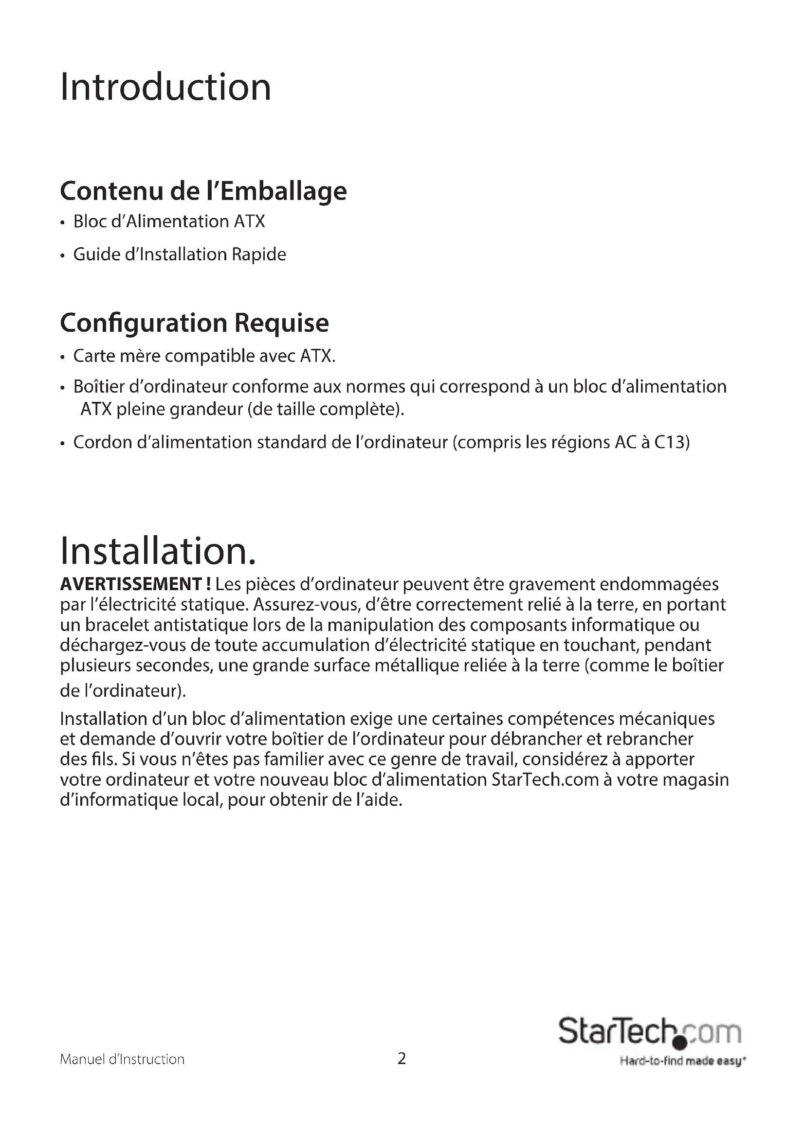 - Cordon d’alimentation standard de l’ordinateur (compris les régions AC à C13) Installation. AVERTISSEMENT ! Les pièces d’ordinateur peuvent être gravement endommagées par l’électricité statique. Assurez-vous, d’être correctement relié à la terre, en portant un bracelet antistatique lors de la manipulation des composants informatique ou déchargez-vous de toute accumulation d’électricité statique en touchant, pendant plusieurs secondes, une grande surface métallique reliée à la terre (comme le boîtier de l’ordinateur). Installation d’un bloc d’alimentation exige une certaines compétences mécaniques et demande d’ouvrir votre boîtier de l’ordinateur pour débrancher et rebrancher des ls. Si vous n’êtes pas familier avec ce genre de travail, considérez à apporter votre ordinateur et votre nouveau bloc d’alimentation StarTech.com à votre magasin d’informatique local, pour obtenir de l’aide.Manuel d’Instruction